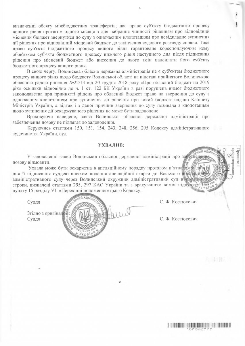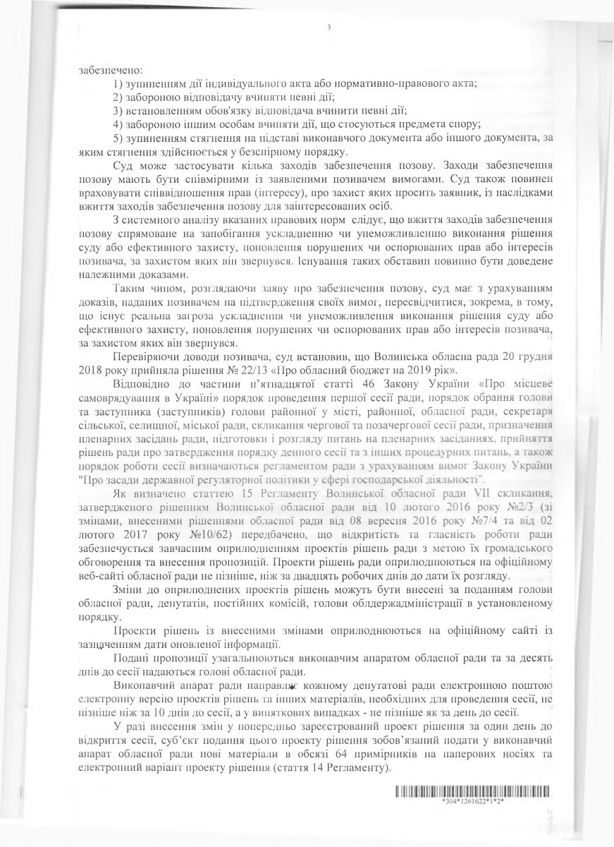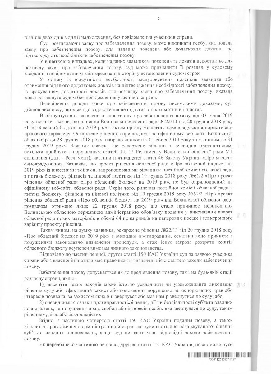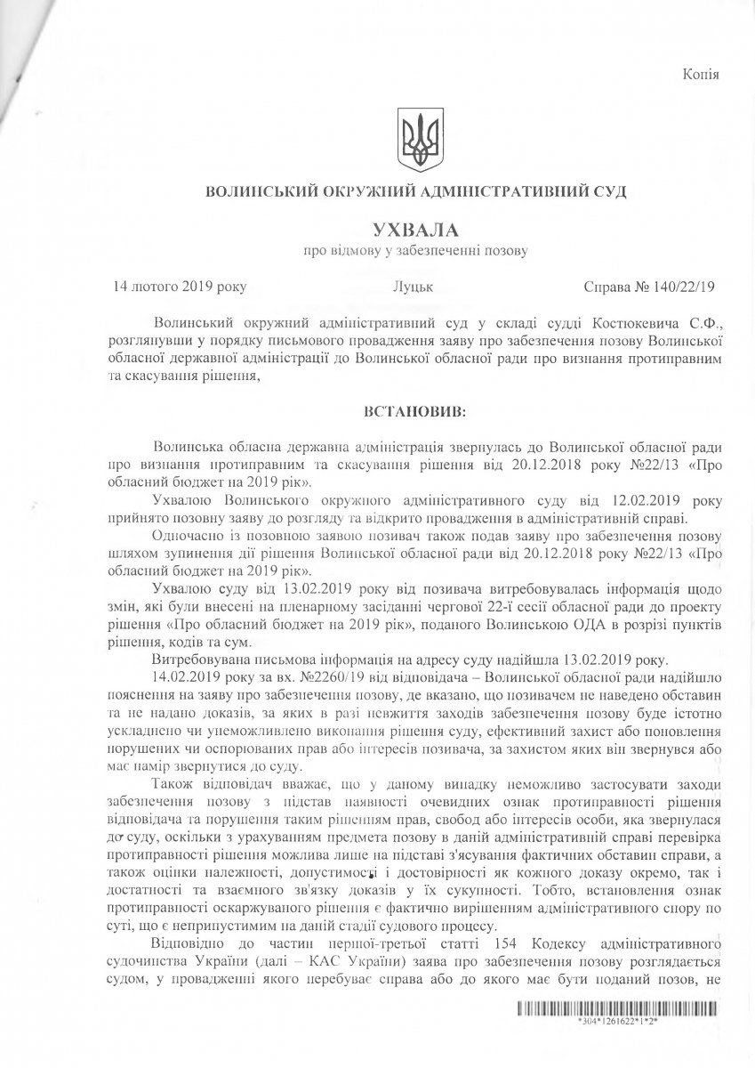 У свою чергу, Волинська обласна державна адміністрація не є суб'єктом бюджетного процесу вищого рівня щодо бюджету Волинської області на підставі прийнятого Волинською обласною радою рішення №22/13 від 20 грудня 2018 року «Про обласний бюджет на 2019 рік», оскільки відповідно до ч. 1 ст. 122 БК України в разі порушень вимог бюджетного законодавства при прийнятті рішень про обласний бюджет право на звернення до суду з одночасним клопотанням про зупинення дії рішення про такий бюджет надано Кабінету Міністрів України, а відтак і з даної причини звернення до суду позивача з клопотанням щодо зупинення дії оскаржуваного рішення не може бути задоволене.