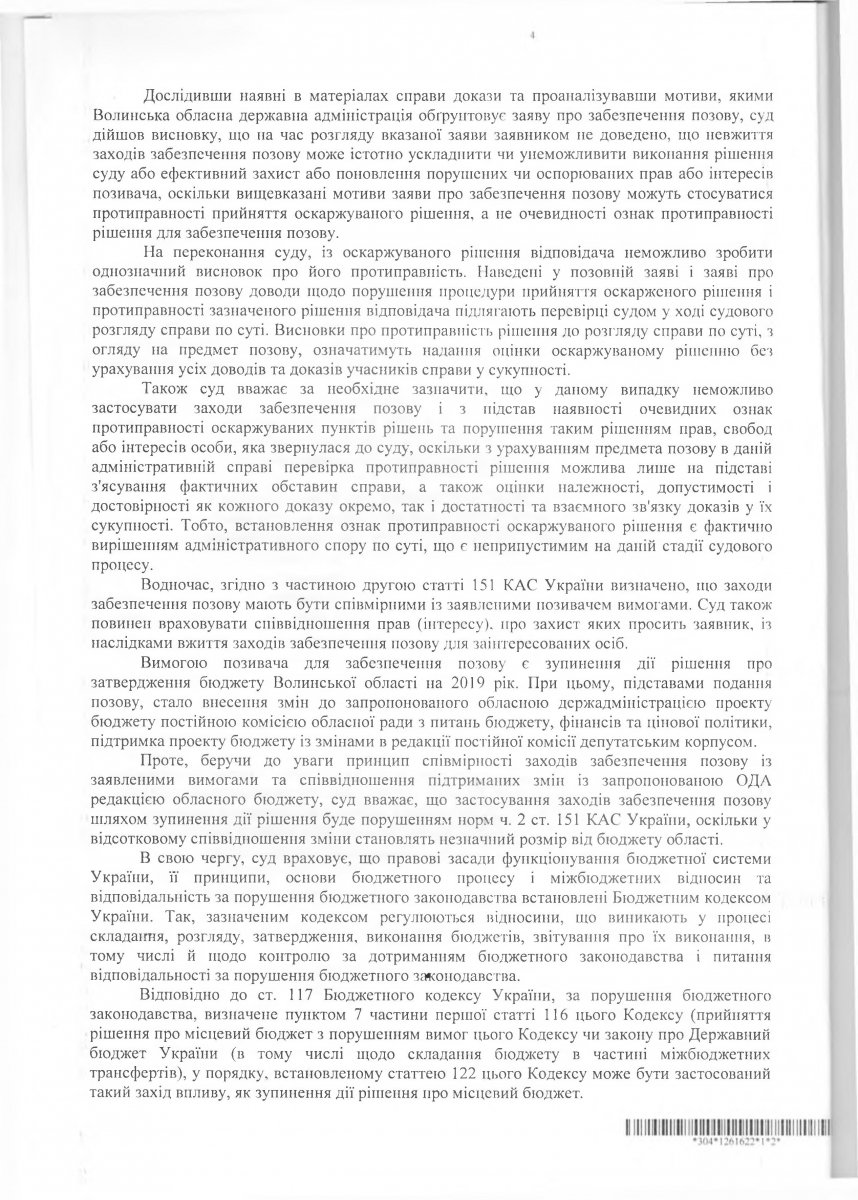 Керуючись статтями 150, 151, 154, 243, 248, 256, 295 Кодексу адміністративного судочинства України, суд відмовив у задоволенні заяви Волинської обласної державної адміністрації про забезпечення позову.