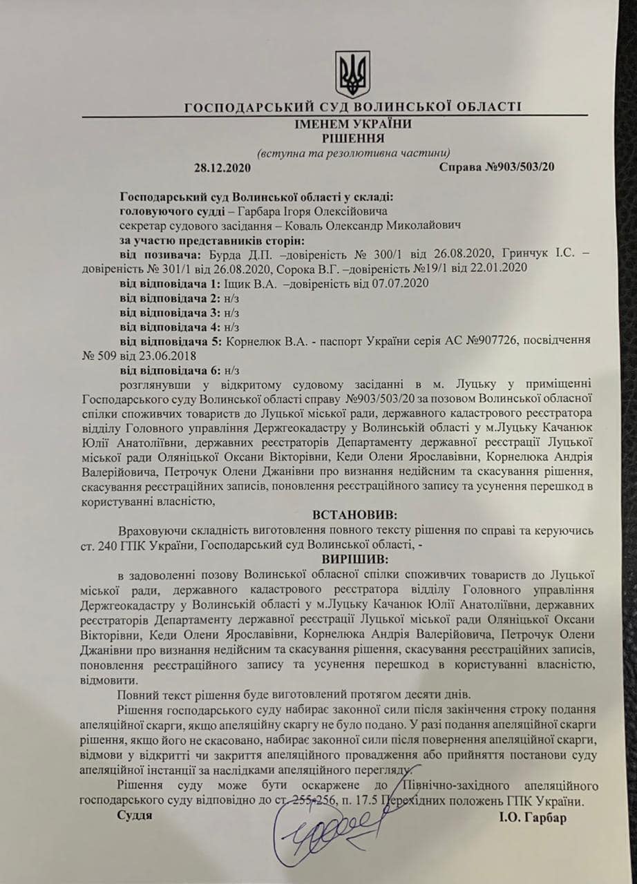 «Господарський суд Волинської області відмовив у задоволенні позову та залишив рішення Луцької міської ради в силі.