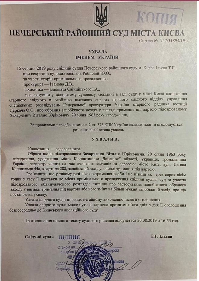 Таке рішення суд ухвалив 15 серпня за клопотанням прокурора Генеральної прокуратури. Захарченку обрано запобіжний захід у вигляді тримання під вартою. На рішення може бути подана апеляційна скарга.