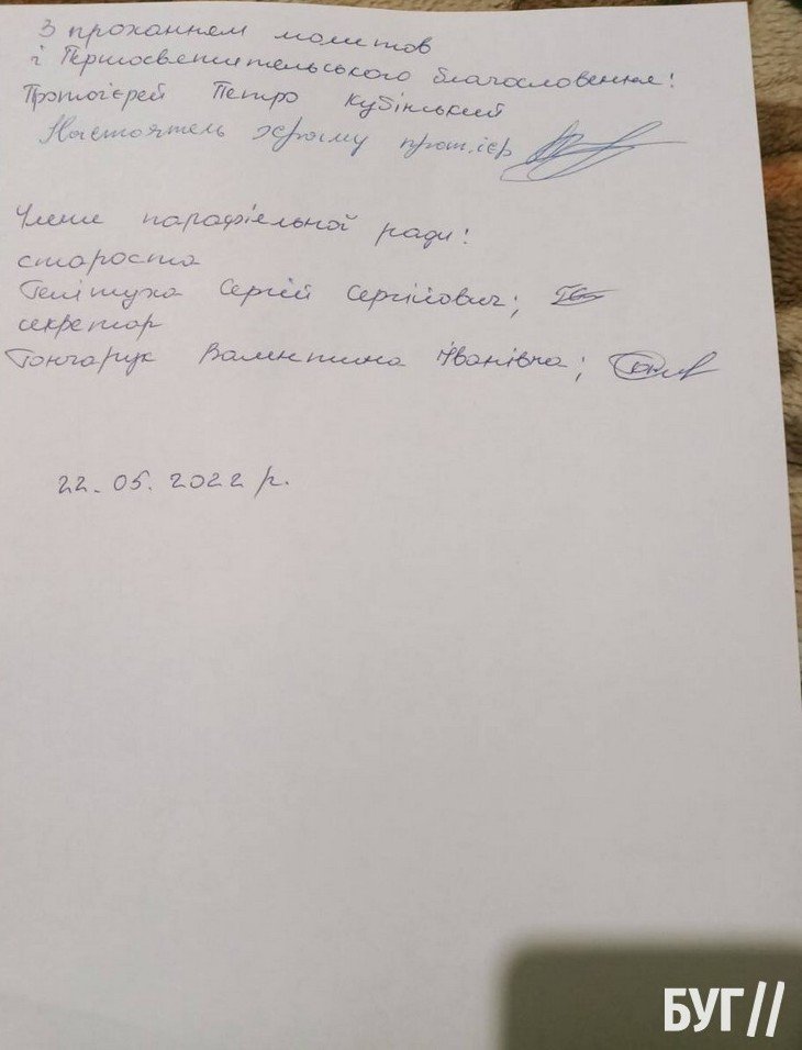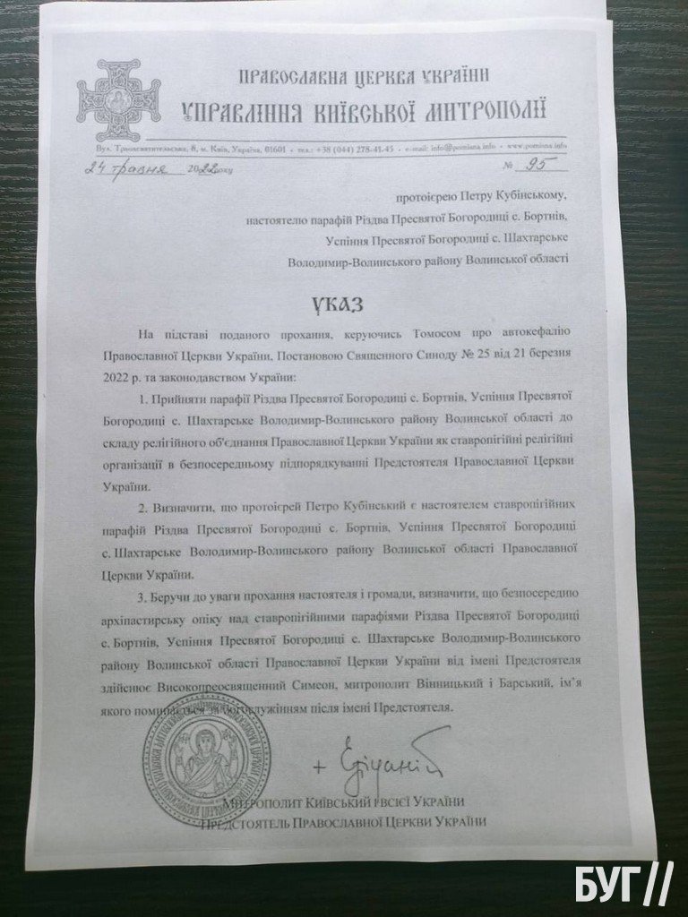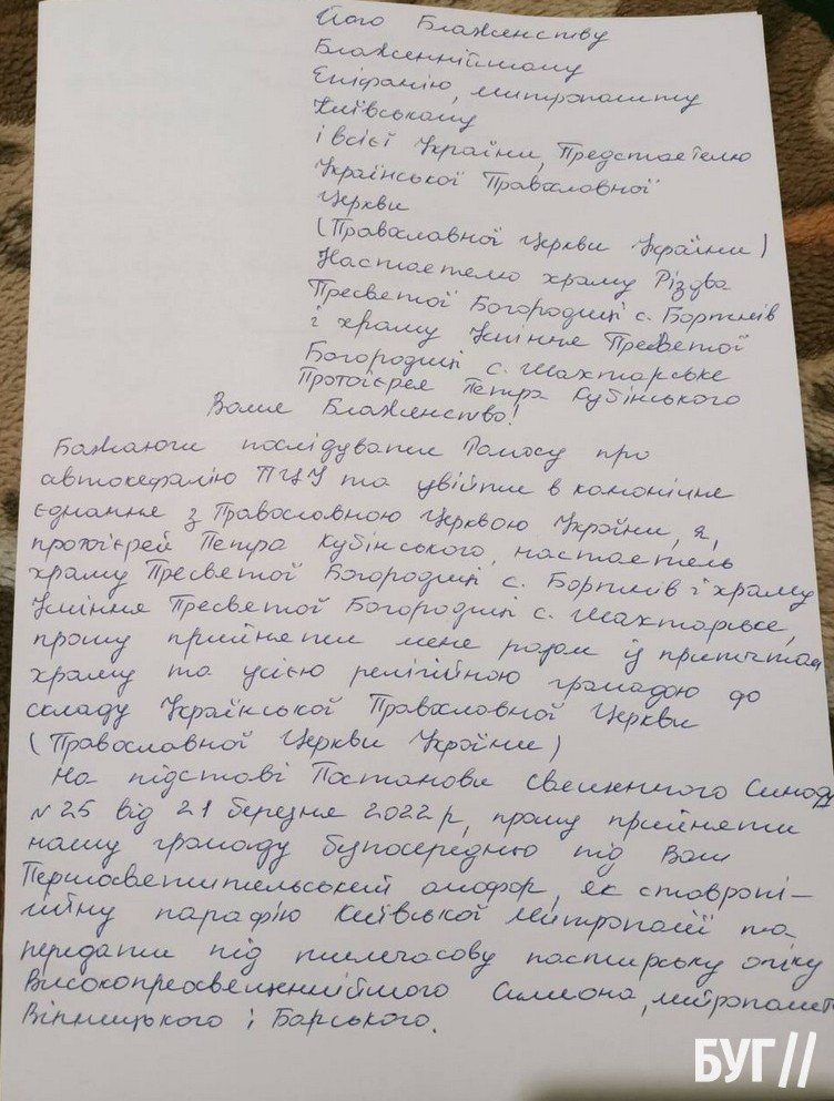 Після цього отець Петро Кубінський, який водночас є ще й настоятелем храму Успіння Пресвятої Богородиці села Шахтарського, написав прохання на ім’я митрополита Епіфанія про прийняття його разом з громадою до ПЦУ під тимчасову пастирську опіку митрополита Вінницького і Барського Симеона.