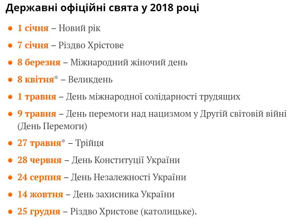 Дати державних свят незмінні щороку. Виняток – Великдень і Трійця, вони позначені зірочкою*, пишуть Факти.