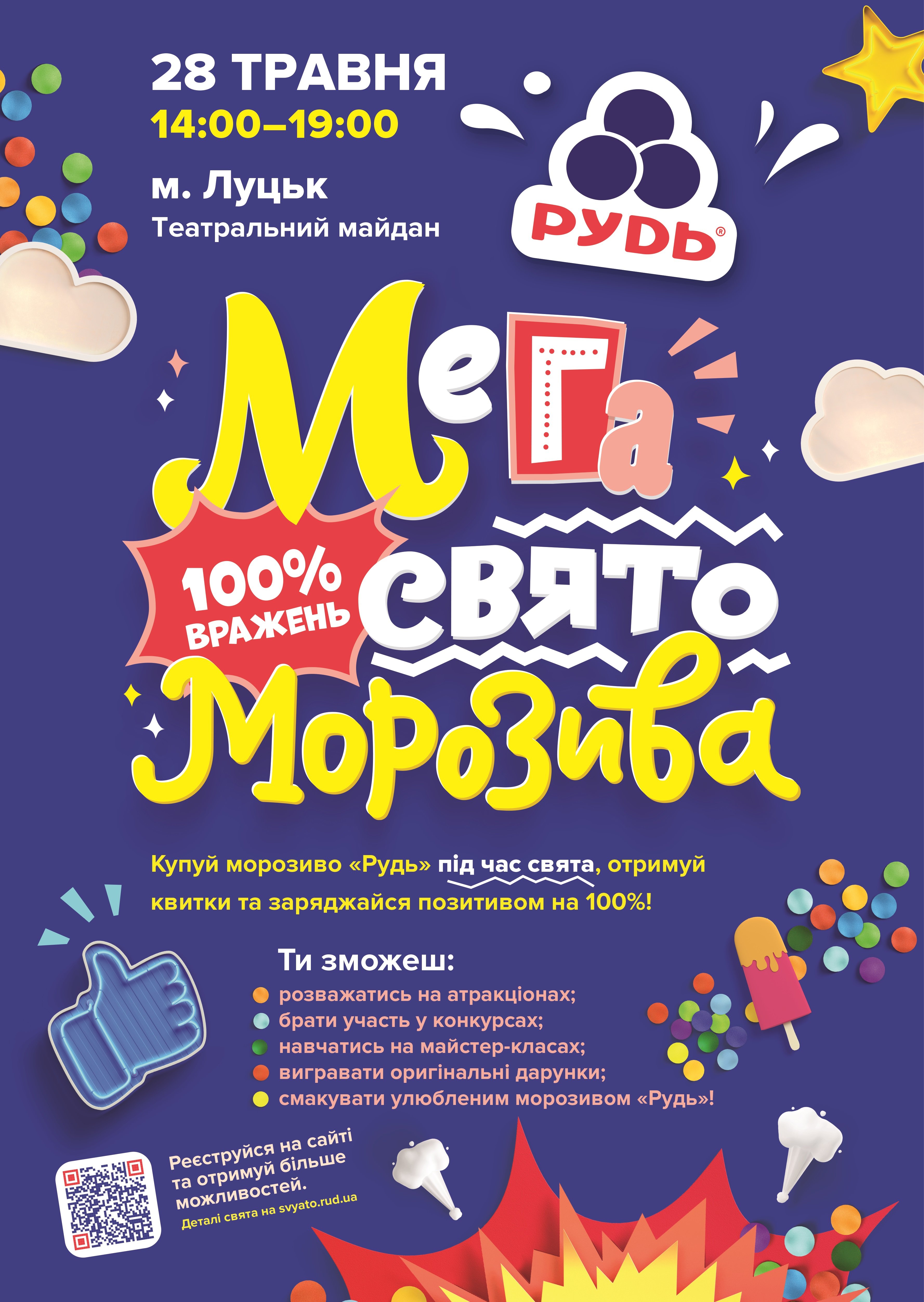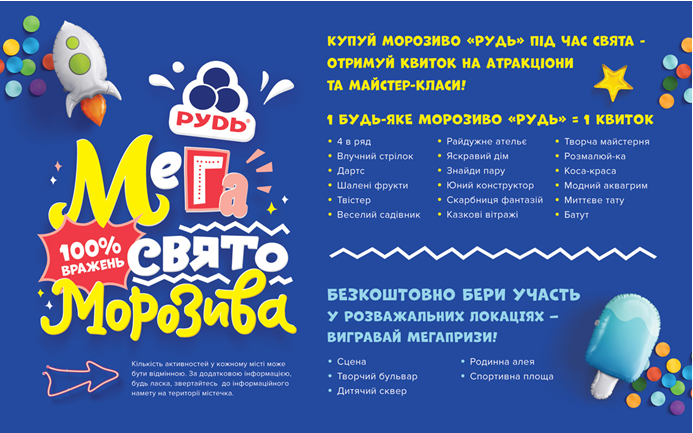 Цього року Свято Морозива завітає більш ніж до 15 міст України. Слідкуйте за графіком свят на сайті svyato.rud.ua. Головна мета цьогорічного заходу — 100 відсотків вражень. Чим зумовлено зміни формату? Ми доклали всіх зусиль, щоб наші гості почували себе на святі максимально комфортно. Найважливіше — це родинне спілкування. Ми дуже хочемо, щоб батьки проводили більше часу зі своїми дітьми, адже сім’я — це єдине ціле. Тому на святі цього року багато саме родинних локацій, конкурсів і розваг. Спрощено механіку обміну та розширено соціальну складову проекту. Навіть якщо ти випадково потрапив на захід і хочеш взяти участь в атракціоні — достатньо покуштувати лише одне морозиво! Не хочеш морозива? Гайда на розважальні локації! Бери участь у конкурсах — гарантовано отримуй призи! Чекаємо всіх на святі!