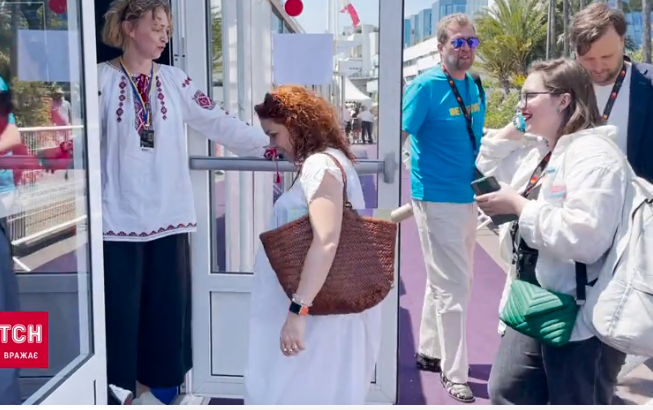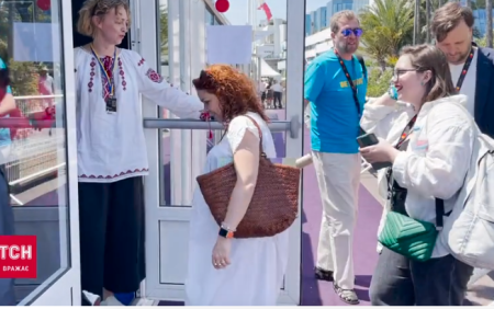 Жінка потрапила на камеру кореспондента ЗМІ в українському павільйоні на кіноринку у Каннах, Франції. Судячи із зовнішнього вигляду, вона чекає на дитину.