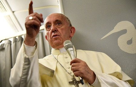 Перед цим Франциск роздав журналістам фотографію 1945 року, зняту в японському Нагасакі. На фото зображений хлопчик, який несе на собі мертвого брата, після удару ядерної бомби. За словами папи, він підписав фото «Плід війни».