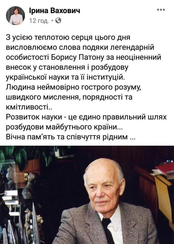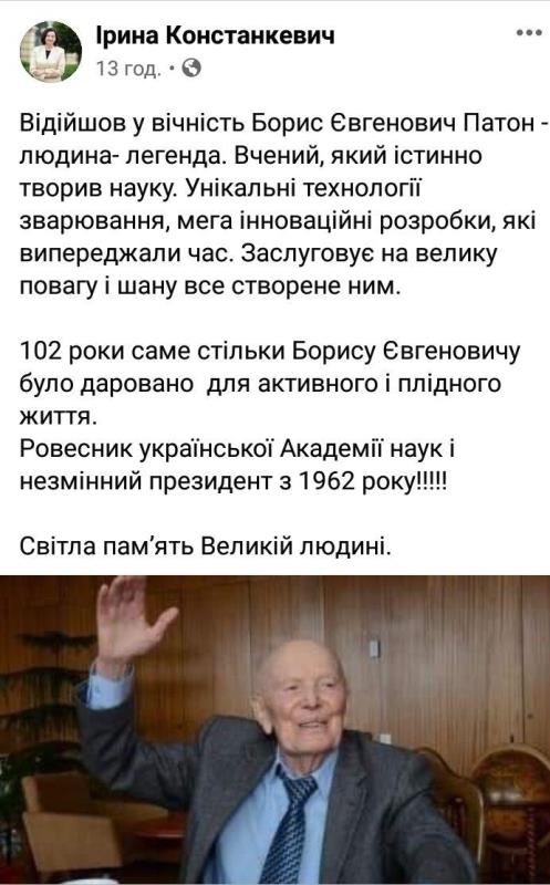«Відійшов у вічність Борис Євгенович Патон – людина-легенда. Вчений, який істинно творив науку. Унікальні технології зварювання, мегаінноваційні розробки, які випереджали час. Заслуговує на велику повагу і шану все створене ним. 102 роки – саме стільки Борису Євгеновичу було даровано для активного і плідного життя. Ровесник української Академії наук і незмінний президент з 1962 року!!!!! Світла пам’ять Великій людині», – написала на своїй сторінці у Facebook народний депутат України Ірина Констанкевич.Голова Волинської обласної ради Ірина Вахович висловила щиру вдячність легендарному вченому за неоціненний внесок у становлення та розбудову української науки та її інституцій.«Пішов з життя великий, геніальний та надзвичайно талановитий вчений і грандіозна людина неймовірних масштабів... Справжній Атлант. Вічна пам’ять», – написав радник Луцького міського голови Ігор Поліщук.«І знав, що лиш великого бажати