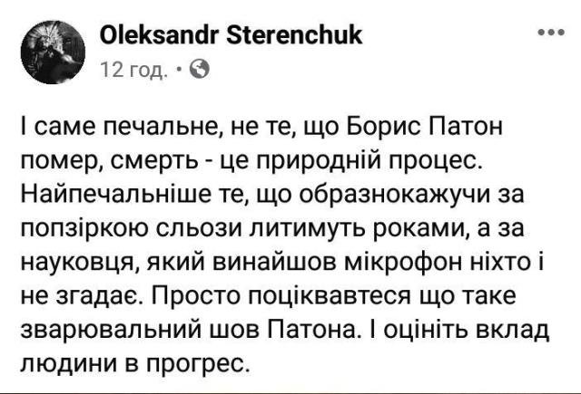 «Просто поцікавтеся, що таке зварювальний шов Патона. І оцініть вклад людини в прогрес», – написав режисер Олександр Стеренчук.«Багато хто пише, що Борис Патон помер, а я вам скажу, що він не вмер. Його праця і пам'ять про нього увіковічені ще за його фізичного життя. І це, друзі, насправді дуже велика справа – прожити велике життя і залишити після себе величну працю, а не шматок лайна, чого нам всім і бажаю», – поділився думками голова ГО «Інститут Соціальної Ініціативи» Ілля Токаренко.