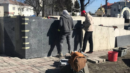 Усього гранітною плитою необхідно облицювати майже 200 квадратних метрів. 5 квітня тут працювало двоє робітників. Для роботи знадобиться від двох до трьох тижнів за умови недощової погоди, каже чоловік.