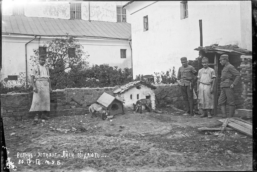 Фотокартки згруповані за тематичним та географічним принципами. 141 світлина належить до території сучасної Волинської області. Це просто безцінне джерело для краєзнавців, адже фотокарток періоду Першої світової війни збереглося небагато.Устилуг. Стрільці УСС годують приручених лисиць