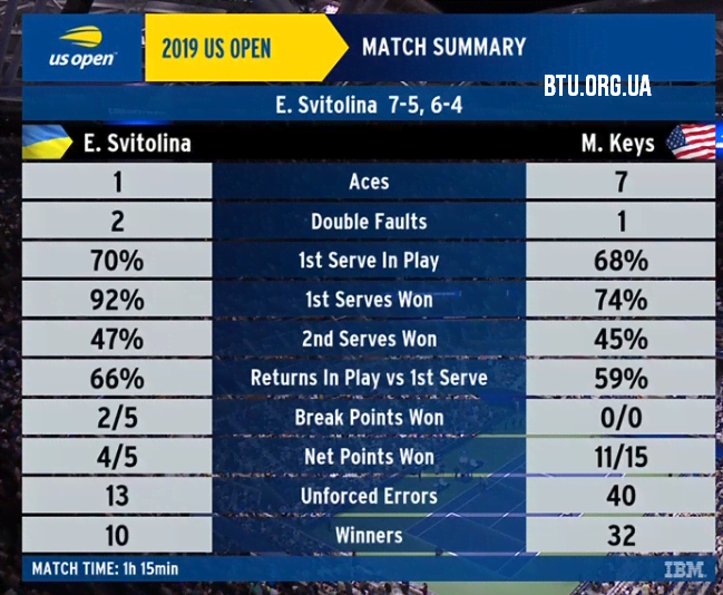 На рахунку українки 1 ейс і 2 подвійні помилки (7/1 у американки), 13 невимушених помилок і 10 віннерів (40/32 у суперниці).