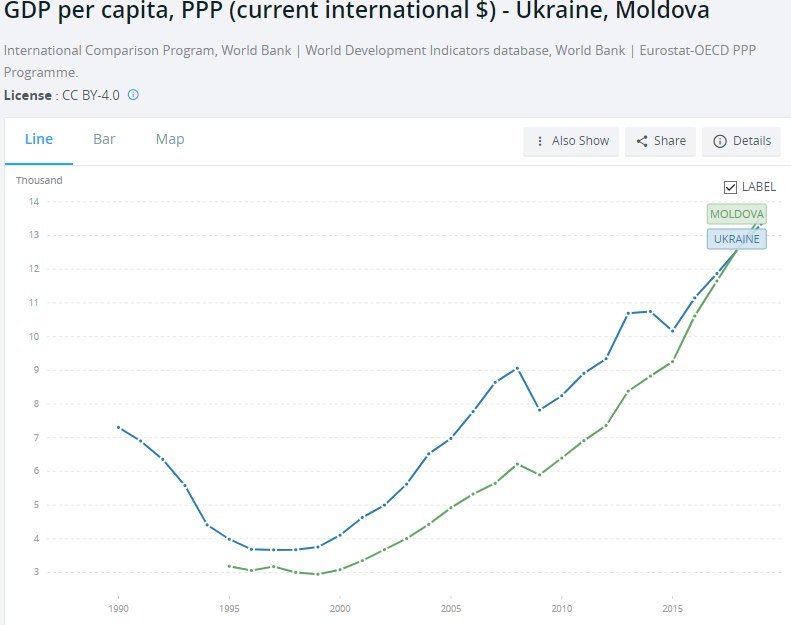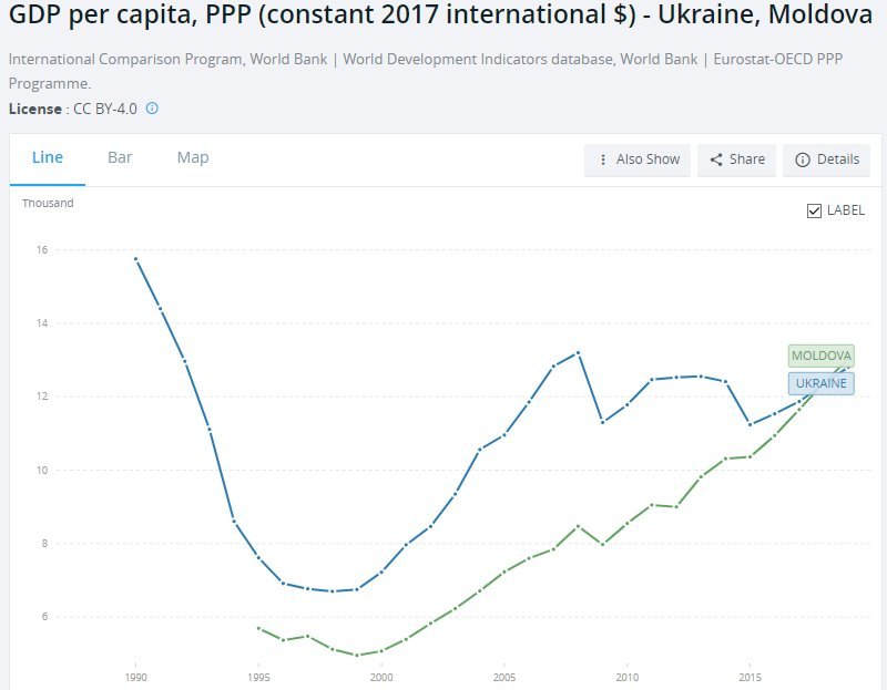 ВВП на душу населення з врахуванням ПКС в постійних цінах 2017 року: Україна $12 810, Молдова $13 034.