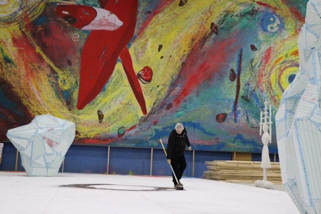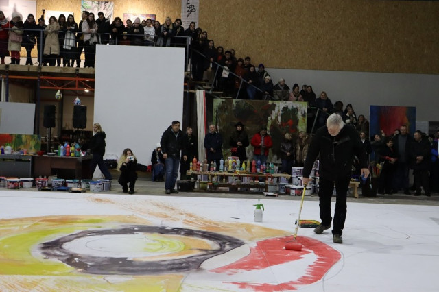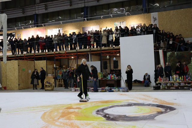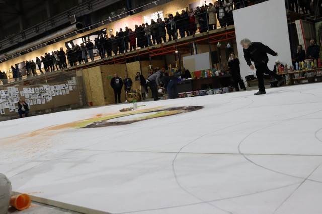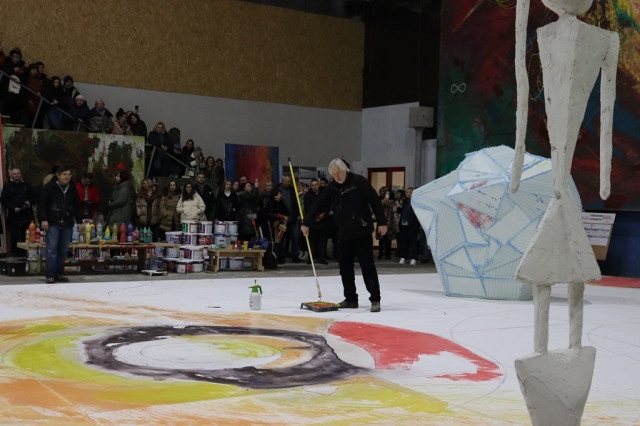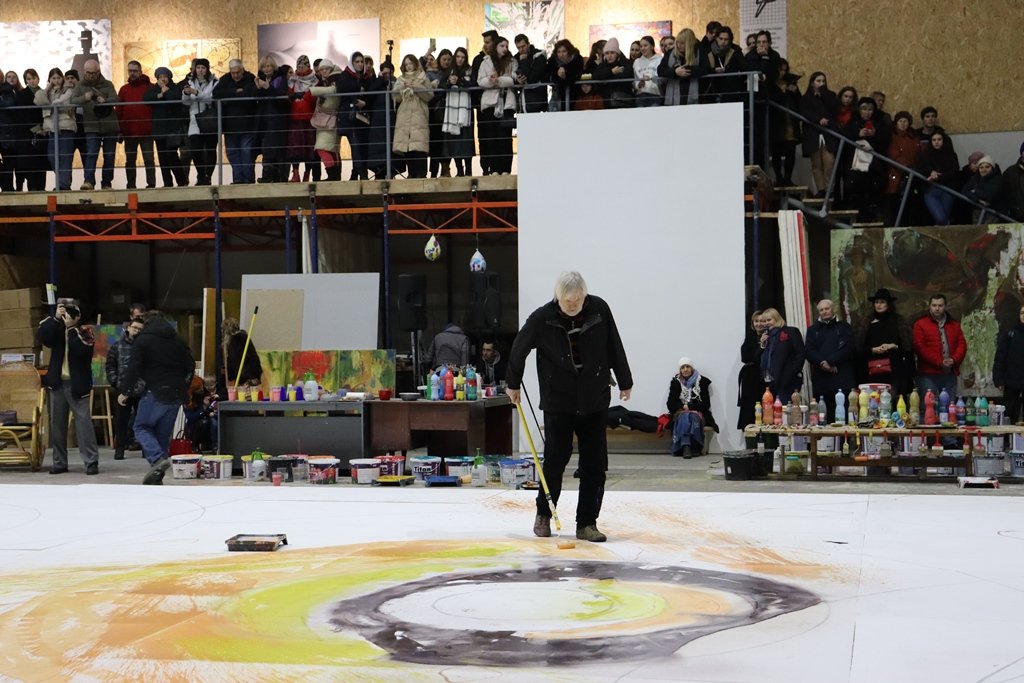 Величезне біле полотно розклали на підлозі, на фоні транслювали відеоарти та документальні кадри, які демонстрували світлі та темні боки людства.Сотні людей прийшли подивитися на це видовищне дійство.