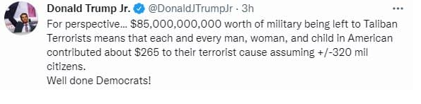 Син колишнього президента США Дональд Трамп-молодший заявив, що в руках руху «Талібан», який захопив території і влада в Афганістані, є військове обладнання та зброю на 85 млрд доларів. Їм його в країні залишили військові США.