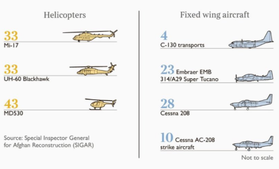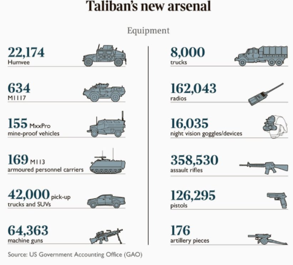 Він також додав, що це означає, що «кожен чоловік, жінка і дитина в Америці пожертвували близько 265 доларів на цілі терористів, якщо виходити з того, що в країні проживає плюс-мінус 320 мільйонів громадян».Мова йде про сотні тисяч одиниць стрілецької зброї, майже двохстах вертольотах і літаках, а також великій кількості автомашин. Крім того, талібам дісталися прилади нічного бачення, бронежилети і багато іншого.Нещодавно міністр оборони Росії Сергій Шойгу заявив, що рух «Талібан» завдяки покинутій американськими військовими зброї зараз озброєний краще, ніж армія України.