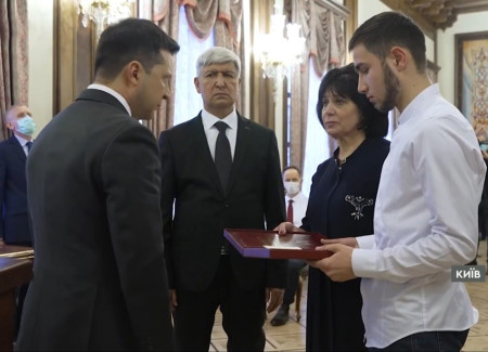 Сьогодні, 29 грудня 2021 року, Президент України Володимир Зеленський вручив сину Рустама Хамраєва посмертну нагороду батька – посвідчення до звання Героя України та орден «Золота зірка».