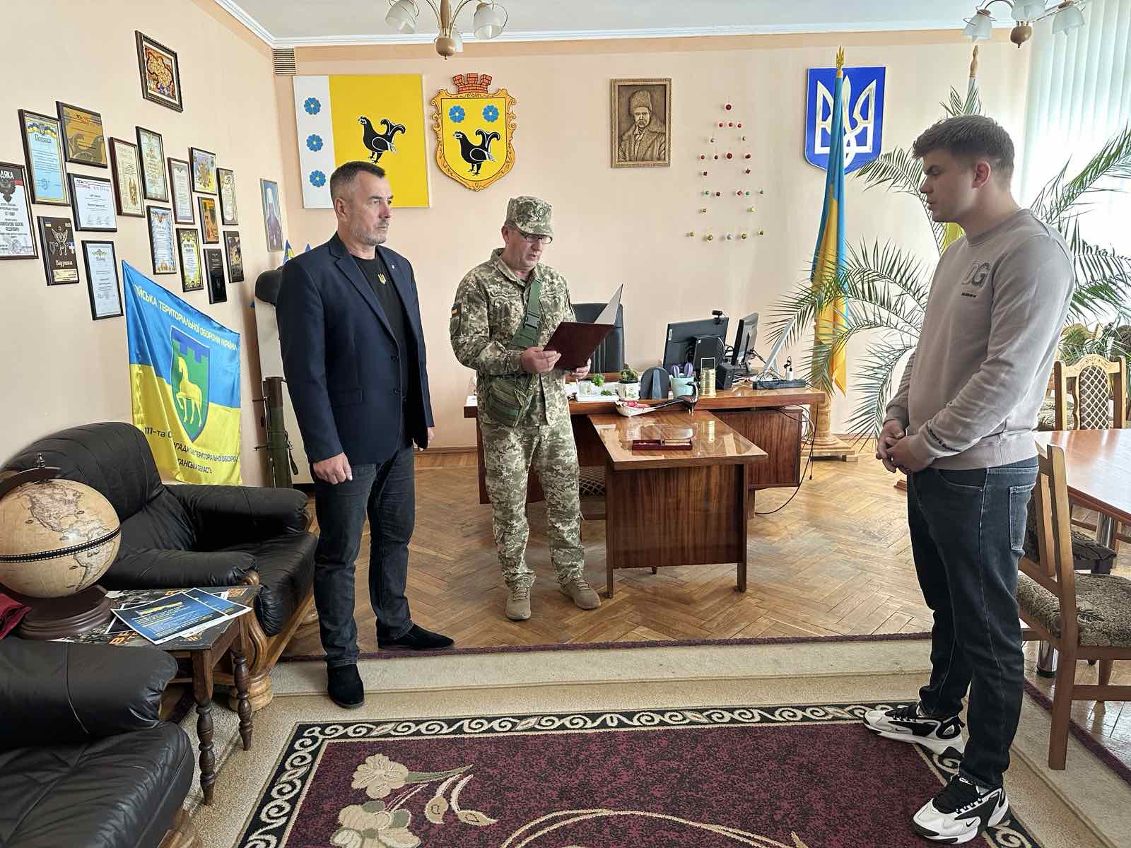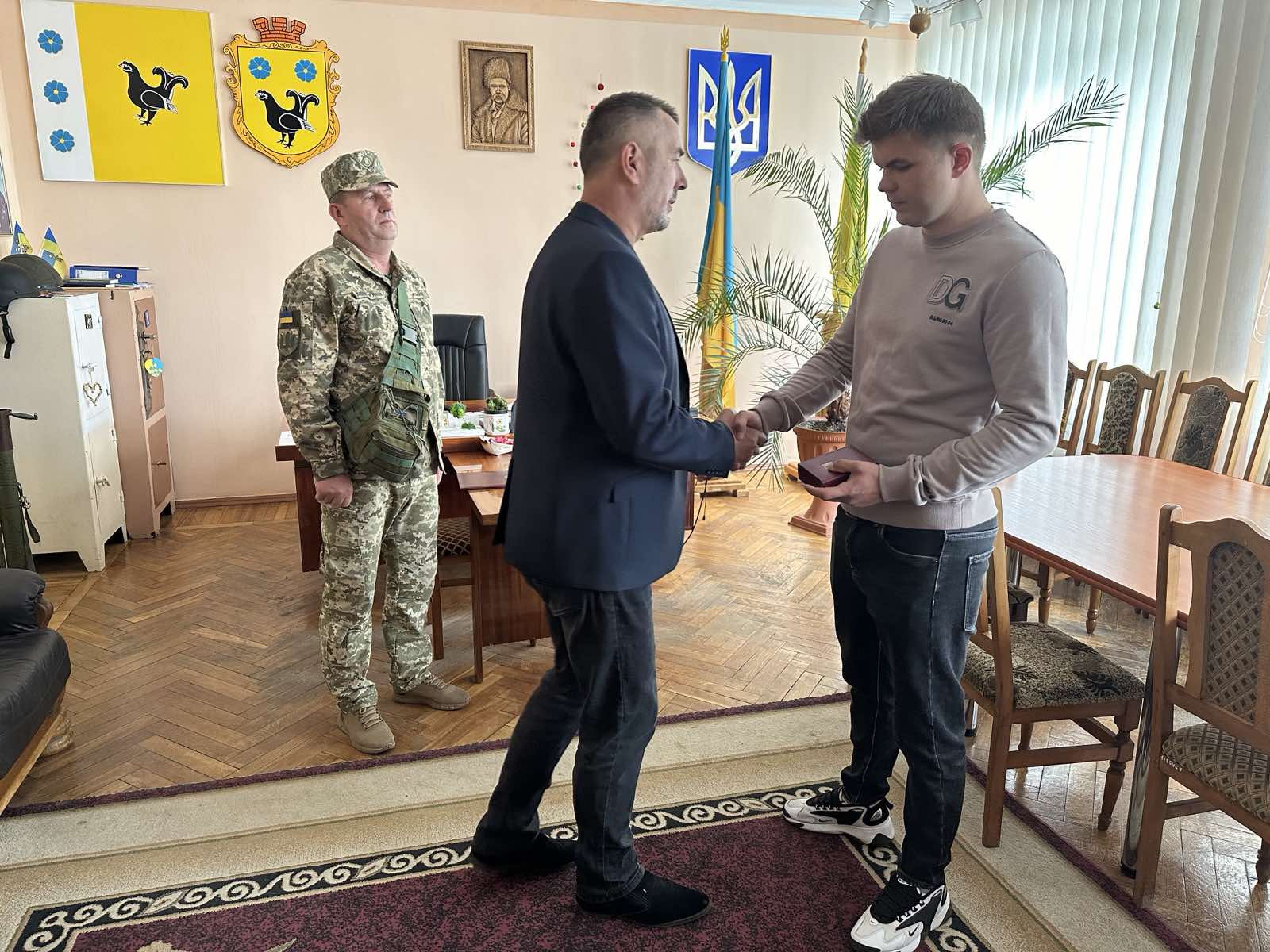 Селищний голова Василь Камінський спільно начальником відділення рекрутингу та комплектування П’ятого відділу Ковельського РТЦК та СП Валерієм Хомичем вручили відзнаку сину загиблого Героя Роману.