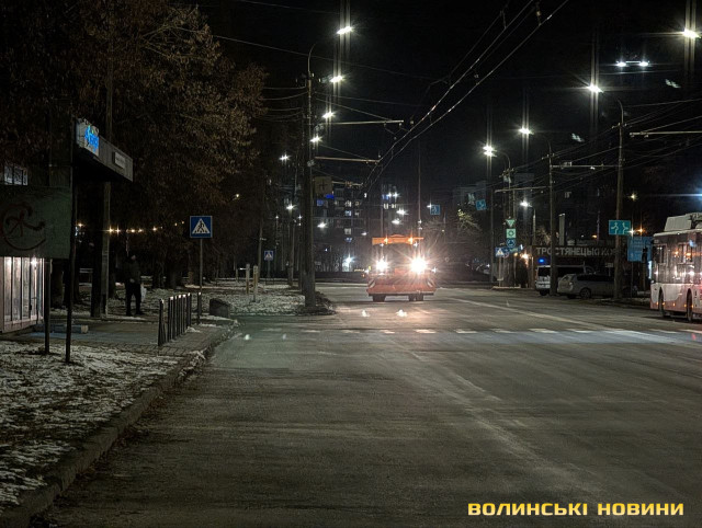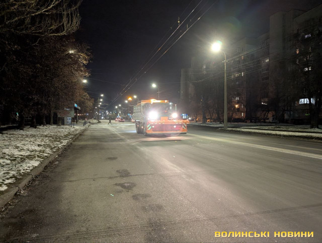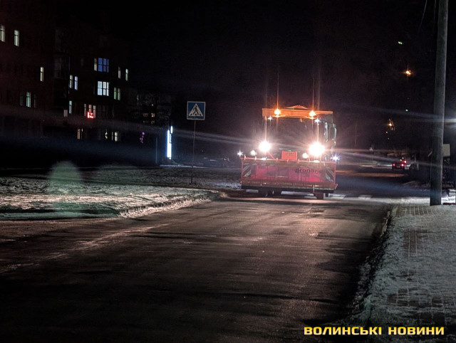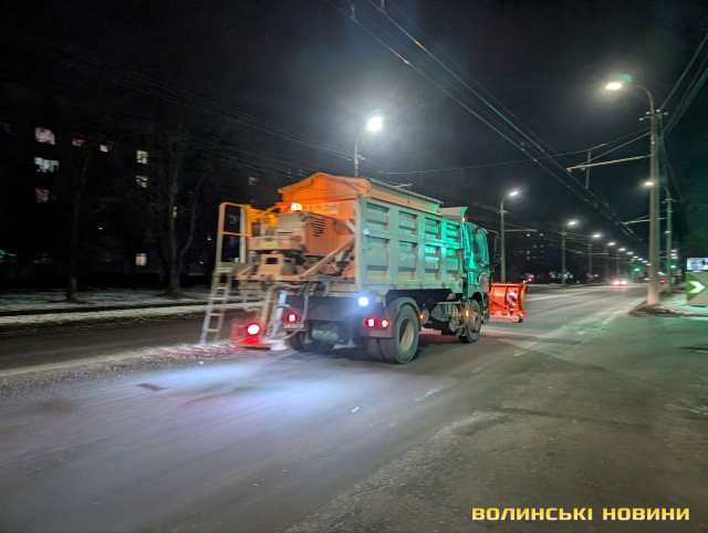 Наразі з 20:00 у місті працює вже п’ять одиниць техніки – посипають автошляхи по всьому Луцьку.Після початку опадів на вулиці міста вийде більша кількість техніки з відвалами для безпосереднього очищення доріг від снігу та снігових заметів, а також трактори для очищення тротуарів.Читати ще: Скільки громади на Волині витратять на прибирання снігу
