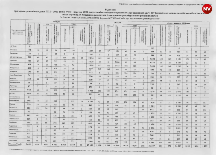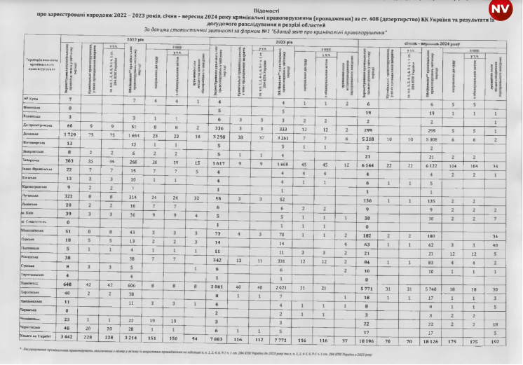 Найбільше проваджень щодо СЗЧ було відкрито протягом січня-вересня 2024 року – 35 307. Левову частку справ порушили у Донецькій області (8 574), а також у Дніпропетровській (3 308), Житомирській (2 433), Львівській (2 170) та Чернігівській (2 010). Найбільше справ до суду передали у Львівській (184) та Запорізькій (177) областях.Крім того, з огляду на статистику, протягом 2022-2024 років в Україні було відкрито 29 521 провадження щодо дезертирства (ст. 408 ККУ). З яких тільки 442 направили до суду, а 414 закрили.