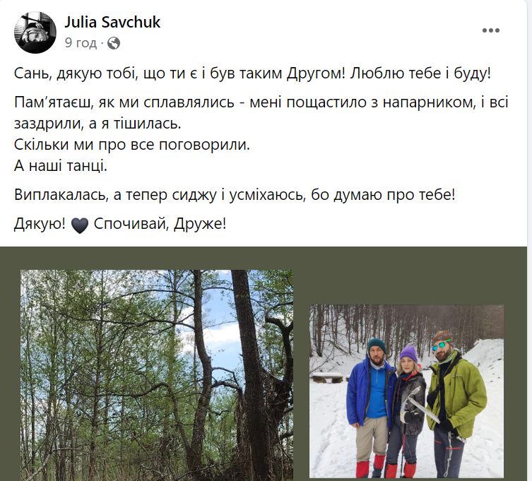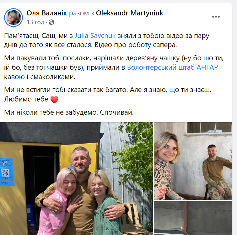 «Хто не знав Олександра, це з тих людей, які обертають колесо історії. 100% ідеаліст. Завжди там де найважче. Завжди на передку. Без зайвих слів і пафосу робив свою роботу. Достойно. Шляхетно. Ефективно. В команді і сам. Один з найкращих... Гордий, що знав тебе. Обов’язково вирвусь, щоб попрощатись з тобою», – йдеться у дописі самооборонівця Сергія Чурікова.