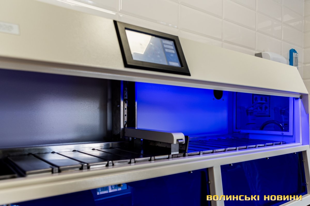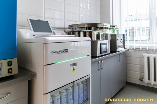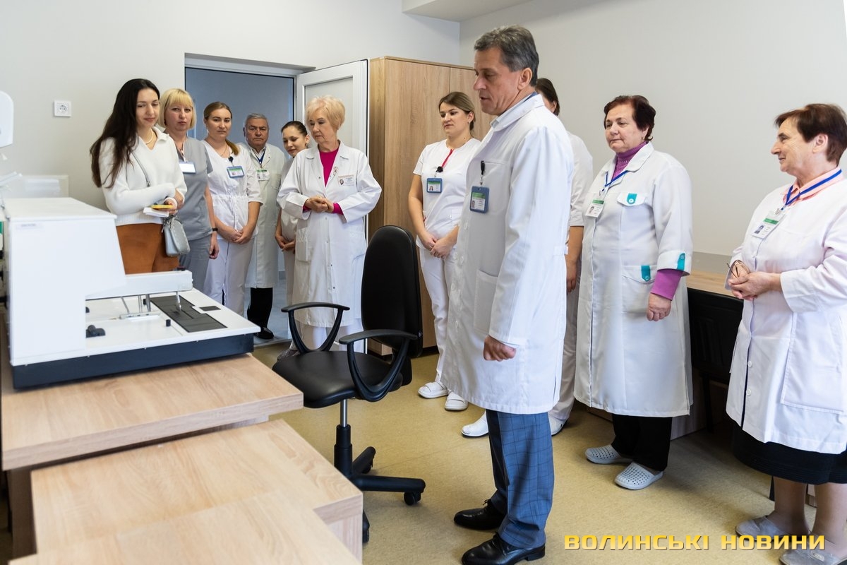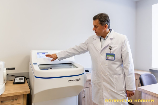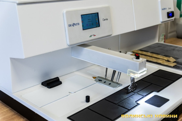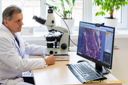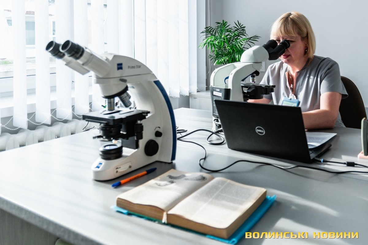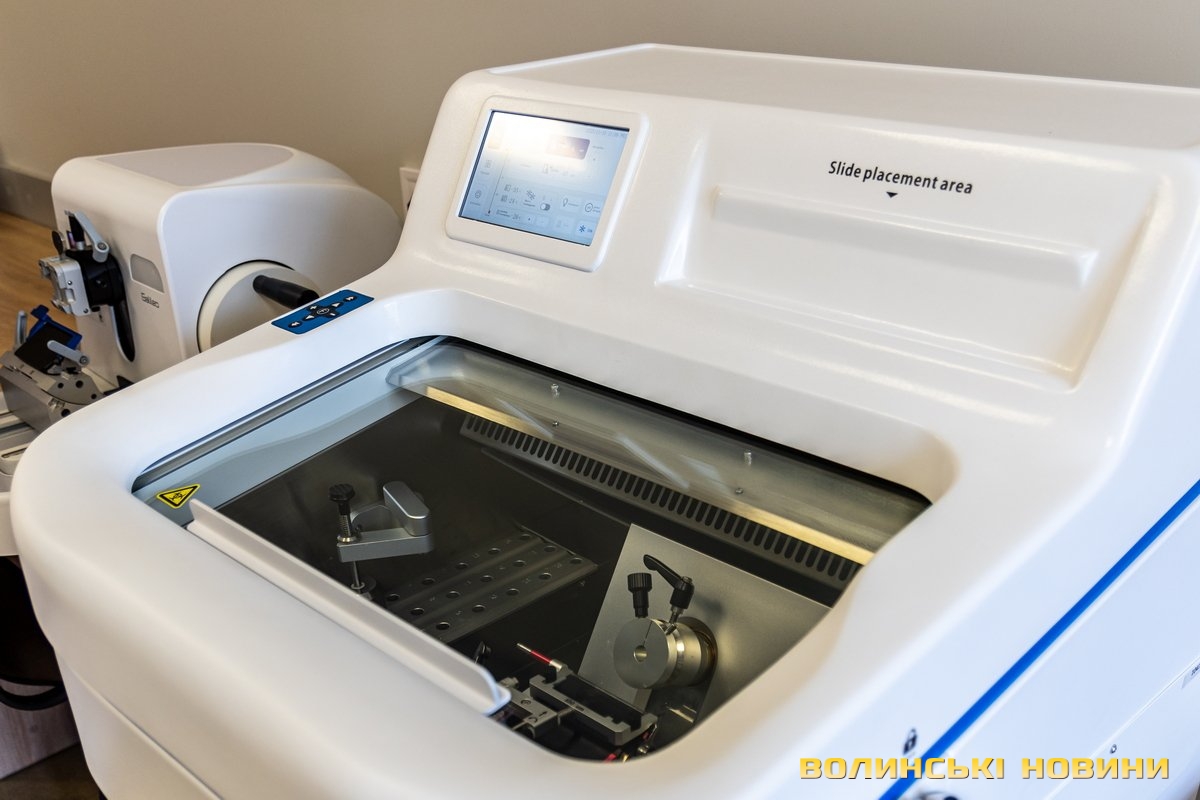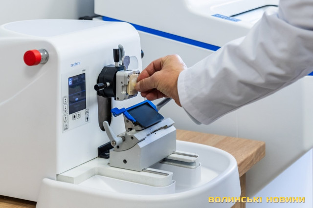 Готовий гістологічний препарат наші лікарі переглядають на бінокулярних мікроскопах, які мають достатнє збільшення. І дають гістологічний діагноз. До слова, завдяки спеціальним програмам гістологічні знімки можна відразу пересилати, наприклад, через месенджери для консультації з колегами. Діагноз передають у відділення, в історію хвороби пацієнта», – пояснив завідувач відділення Володимир Онищук.Для встановлення точного діагнозу дуже важлива наявність якісного гістологічного матеріалу, що, своєю чергою, гарантує новітня техніка. За словами Володимира Онищука, у лабораторії є унікальне для Волинської області обладнання. Наприклад, це станція для заливки гістологічного матеріалу з термо-, кріоплатформами та кріомодулем для швидкого й ефективного охолодження гістологічних і біопсійних касет, кріостат-мікротом, автостейнер для фарбування гістологічних препаратів чи вакуумний гістопроцесор закритого типу для зневоднення та ущільнення матеріалу.