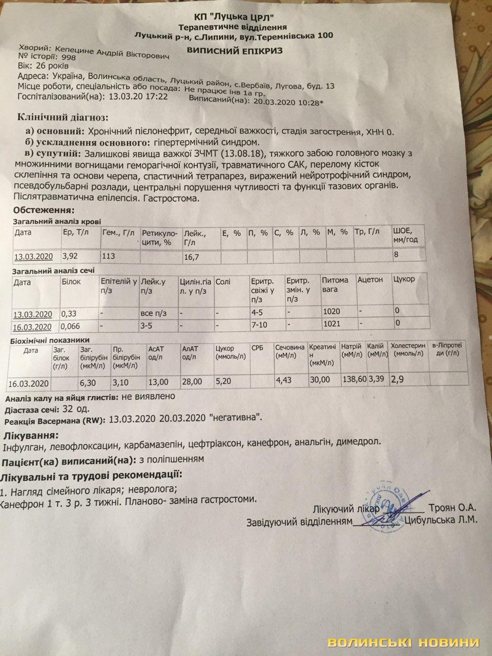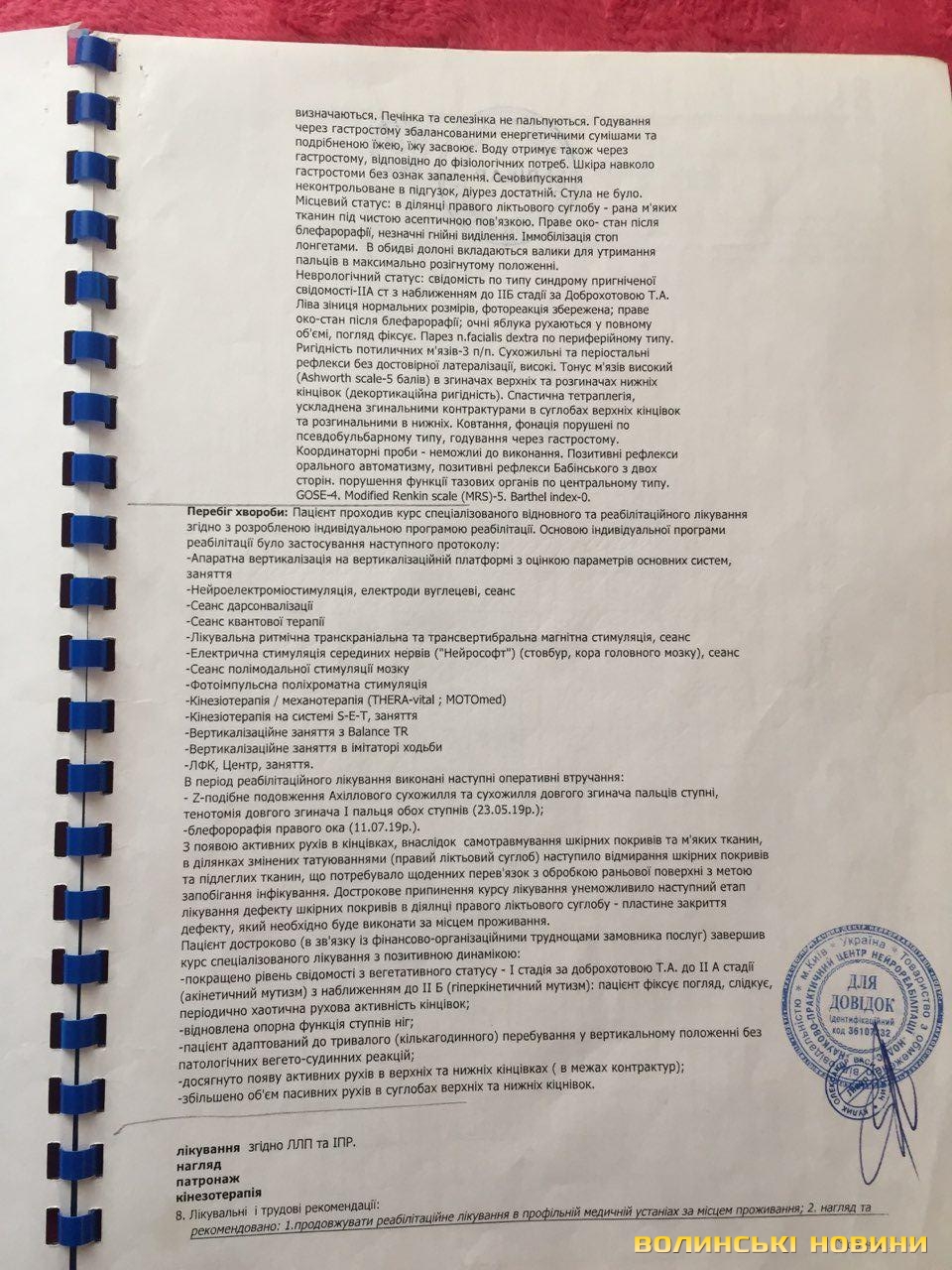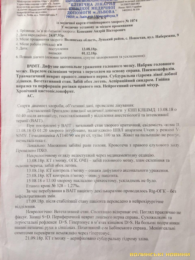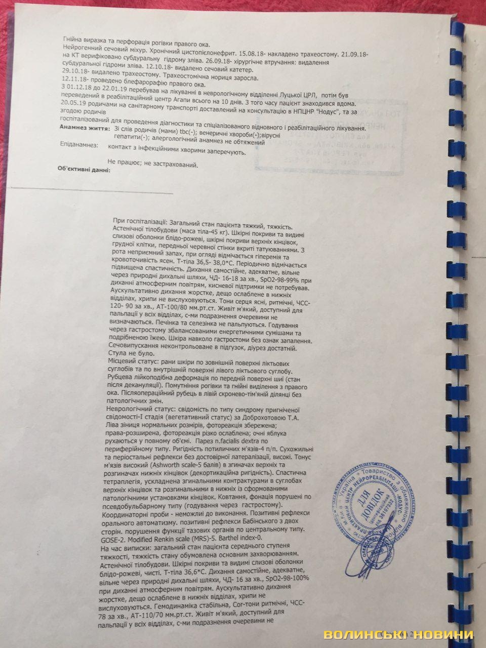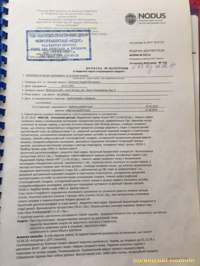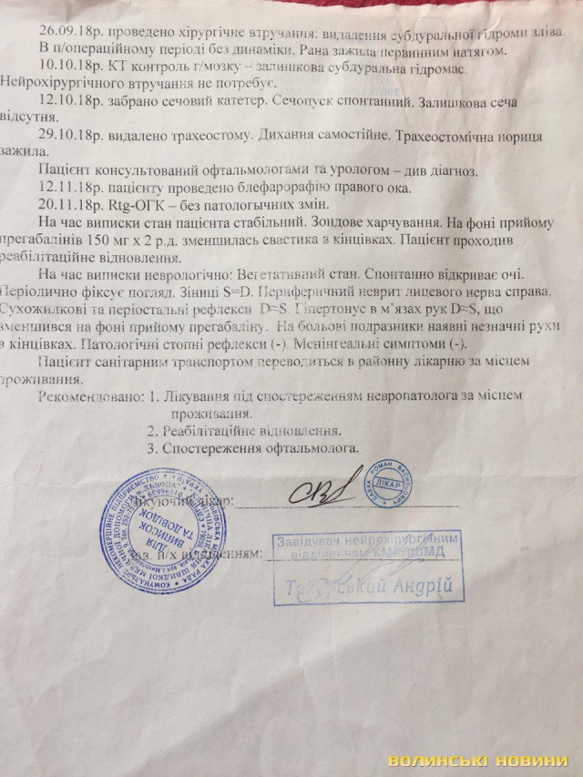 Основний клінічний діагноз Андрія: внутрішньочерепна травма з тривалим коматозним станом з відкритою внутрішньочерепною раною (ВЧМТ. Диф. Аксональне ураження головного мозку. Перелом склепіння черепа із переходом на основу справа, стан після видалення субдуральної гігроми зліва – 26.09.18р.).Ускладнення: постравматична невропатія правого лицевого нерву. Вегетативний стан. Спастичний тетрапарез. Супутній дагноз: кератопатія ОД. Ангіоспазм судин сітківки ліворуч. В’ялогранулюючі рани обох п’яток. Гастростома. Хронічний пієлонефрит, латентний період, ХННО. Із центральної лікарні Андрія виписали 22 січня 2019 року. За час перебування у стаціонарі за висновком від лікаря: «без суттєвих динамічних змін, потребує постійного стороннього догляду, заняття з реабілітологом».