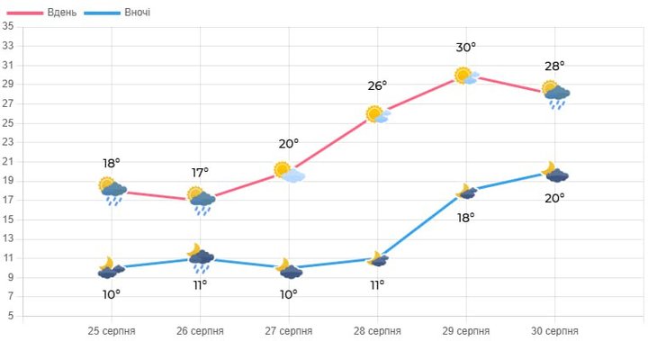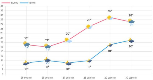 У суботу, 30 серпня, синоптики прогнозують мінливу хмарність. Вночі без опадів, вночі місцями невеликий короткочасний дощ. Вітер південно-східний, 5-10 м/с. Температура повітря вночі – 14-19° вдень – 26-31°.