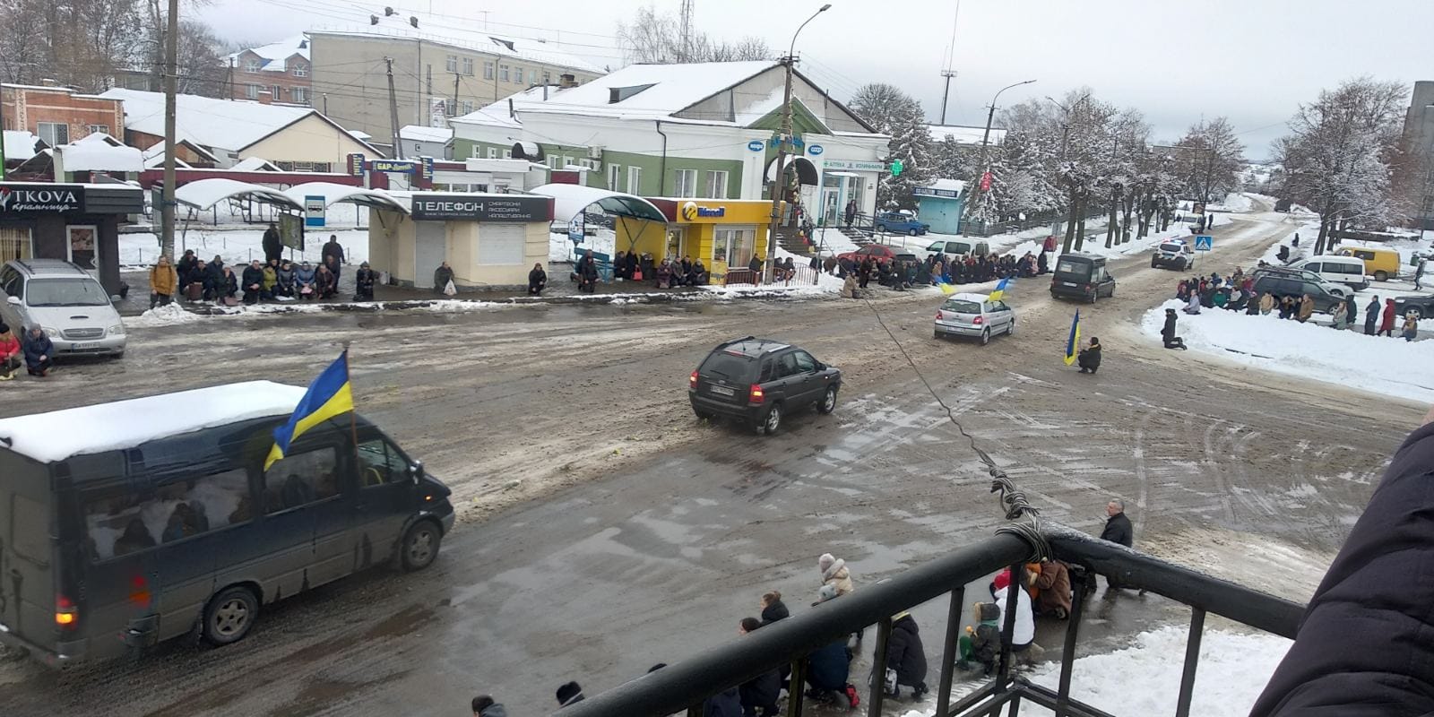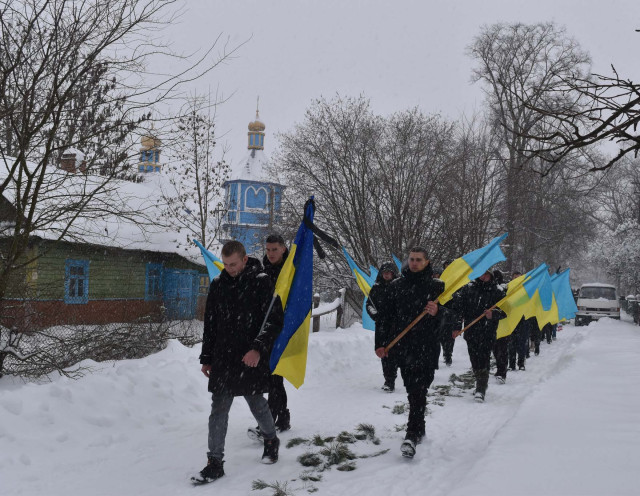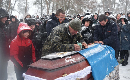 Снігопад безперервно намагався вкрити якомога густішою білою пеленою дорогу, якою сотні людей, одягнені в чорне, одночасно несли у зранених душах смуток та біль невиправної втрати. І лише кетяги калини із запашним сосновим гіллям, вистелені на шляху, кривавими барвами де-не-де пробивалися з-під покрову, а вгорі яскраво майоріли синьо-жовті стяги та букети квітів.