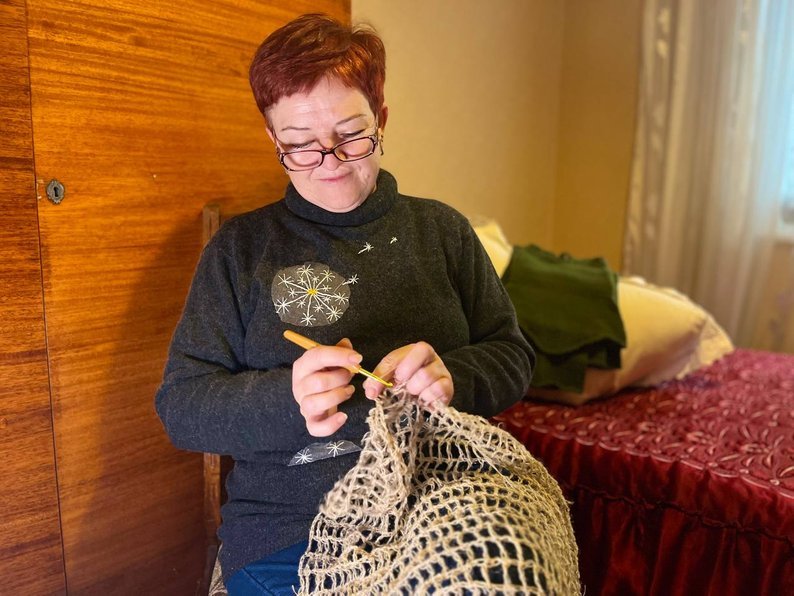 «Обов’язково натуральна, щоб в тепловізорі не було видно, бо то для розвідників, самі розумієте. Я в’яжу красиві речі: але зараз на красу часу не має. Спіднички, кофточки, блузочки. Як видається час, то краще взяти замовлення, заробити грошики, і купити якоїсь коноплі чи задонатити більше», – сказала волинянка.Переселенка із Лисичанська Луганської області Ольга Запорожець для створення майбутнього нашоломника розпускає нитки мішковини.