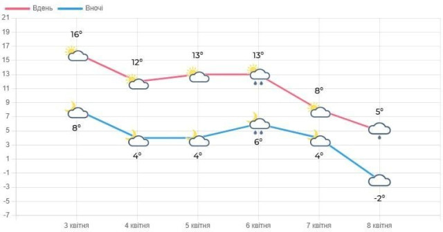 Із понеділка, 6 квітня, натомість очікують нестійку погоду. Пройдуть опади у вигляді дощу, вночі 8 квітня – з мокрим снігом. Температура повітря вночі становитиме 0-5°, вдень – 5-10°. Із середи, 8 квітня, буде зниження температури. Вночі можливі заморозки в повітрі.