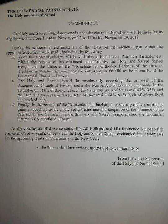 "У контексті раніше прийнятого рішення Вселенського патріархату надати автокефалію Українській церкві, і в очікуванні видачі Патріаршого і Синодального Томосу, святий і священний Синод підготував статут Української церкви«.