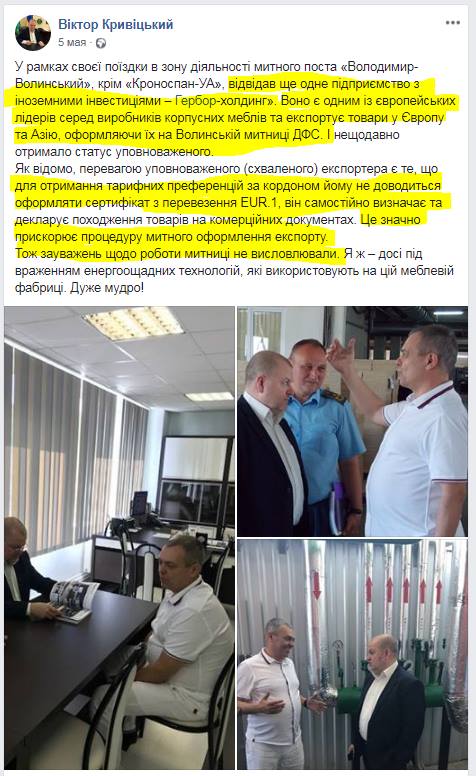 «Нещодавно начальник Волинської митниці Віктор Кривіцький на своїй сторінці у Фейсбуці похвалився, що відвідав у Володимирі-Волинському меблеву фабрику «Гербор-Холдінг».