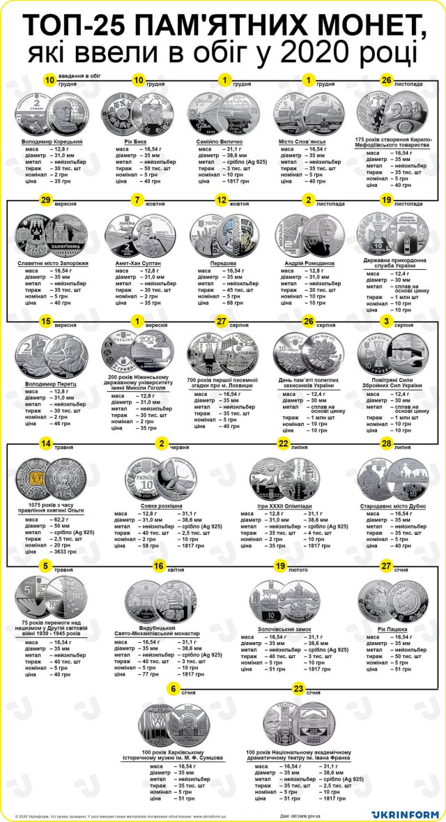 ТОП-25 пам'ятних монет, які ввели в обіг у 2020 році. Інфографіка