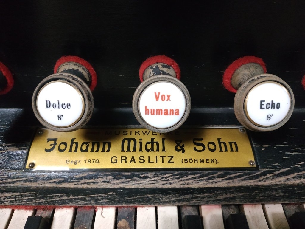 Музичний інструмент виготовили у 1870 році. Фісгармонія зберігалася в камінь-каширському костелі, а пізніше опинилася в одного з його прихожан Миколи Арсенюка.«В одному з місцевих храмів (тепер вже можна говорити, що це в раківліському храмі) на дзвінниці є три дзвони з костелу. На одному з них написано: «Дзвін подарований графом Станіславом Красицьким в пам’ять про вірну слугу Павліну Жолтовську у 1927 році парафіяльному костелу у Камені-Каширському». Католики шукали ці дзвони. А я знала, що в них є фісгармонія. Отож, я дала їм інформацію, а вони подарували музею експонат», – розповіла директорка музею.Католики хотіли забрати ті дзвони, а взамін мали виготовити сучасний дзвін. Але через малочисельність парафії ідею не втілили в життя. Тож вони й нині кличуть вірних на молитву в Раків Лісі. А фісгармонь, яка нині прикрашає музей, хочуть відреставрувати.