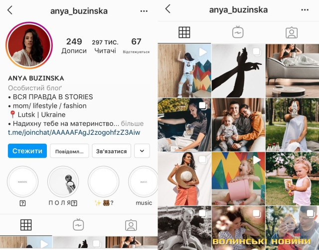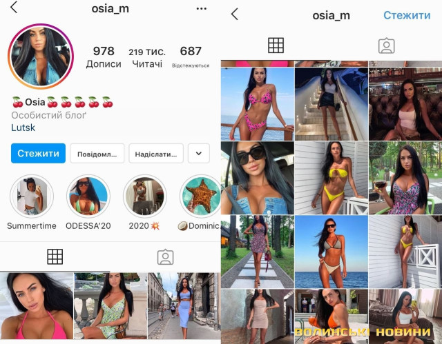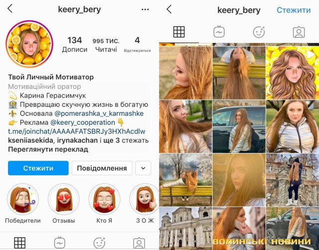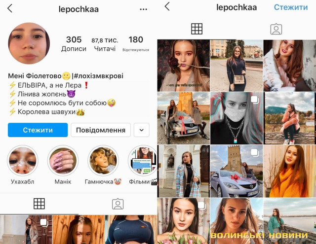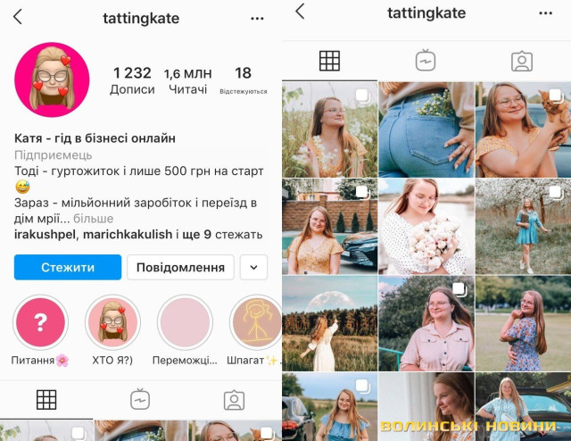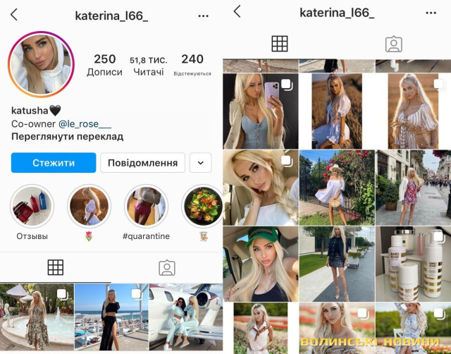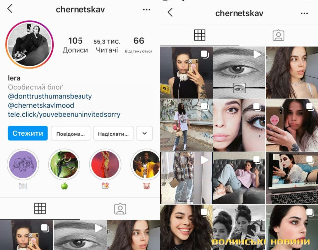 @tattingkate Катя Якимчук. 1,6 мільйона підписників. 20-річна дівчина, яка називає себе «гідом в бізнесі» і переконує, що має мільйонний заробіток.@keery_bery Каріна Герасимчук. 995 тисяч підписників. У шапці профілю вказала себе як «твій особистий мотиватор» та переконує, що «Перетворює скучне життя в багате».@druzhinina_vip_permanent Юліана Дружиніна. 596 тисяч читачів. Луцька бізнес-вумен, чемпіонка світу з перманентного макіяжу.@anya_buzinska Аня Бужинська. 297 тисяч читачів. Про блог пише: «ВСЯ ПРАВДА В STORIES», «mom/ lifestyle / fashion», «Надихну тебе на материнство»@lerkazukerka Лера Кузьмінчук. 274 тисячі підписників. Позиціонує себе в мережі як «little bit poet», «traveler» «mom of Erik».@osia_m 219 тисяч читачів. Персональний блог Ольги Михайлюк. Дівчина мешкає у Луцьку, родом з Ківерців.@nata_fitdom. Наталія Сохацька, Нововолинськ.130 тисяч підписників. Дієтолог, фітнес-тренер, власниця магазину продуктів здорового харчування.@pomerashka_v_karmashke 109 тисяч читачів. Блог Каріни Герасимчук (@keery_bery) про померанських шпіців.@roman_owl Роман Кубай, 100 тисяч читачів. Луцький бізнесмен, який любить подорожувати, фанат автомобілів і має свій навчальний youtube-канал в сфері міжнародної торгівлі @ty4ka_ira Ірина Лиса 101 тисяча підписників. Особистий блог жінки, матері двох дітей.@ilona_mihajlova Ілона Пеценюк (Ілона Добра/Михайлова) 101 тисяча читачів. Свій блог описує так: «з юморком, татушкі, суржик, Марко, не ідеальна, зате чесна; мейкапер»@geroimparable Герардо Аріас 93,7 тисячі підписників. Еквадорець, який одружився з лучанкою і мешкає в Луцьку.@tania_voinarovska Тетяна Войнаровська. 93,7 тисячі читачів. В блозі описує «ріал лайф молодої маман», переконує, що схудла на 34кг.@lepochkaa Ельвіра Лепа. 87,8 тисячі підписників. В шапці профілю вказано: «Мені Фіолетово,#лохізмвкрові», «Лінива жопєнь», «Не соромлюсь бути собою», «Королева шавухи».@olya Ольга Кобахідзе. 86,3 тисячі підписників. Луцька модель Ольга Оніщук, яка вийшла заміж за відомого грузинського футболіста Олександра Кобахідзе. @julia_binkovska Юлія Біньковська 68,4 тисячі підписників. Учасниця ток-шоу «Топ-моделі по-українськи». @lukovnikovtattoo Андрій Луковніков. 61,6 тисячі підписників. Лучанин, який мешкає у Польщі, тату-майстер, музикант.@chernetskav Валерія Чернецька, 55,3 тисячі читачів. Донька ексдепутата Луцької міської ради, бізнесмена Олега Чернецького. @katerina_l66_ Катерина, 51,8 тисячі читачів. Співвласниця магазину одягу.@irafox_design Ірина Лисюк, 51,7 тисячі підписників. Луцька дизайнерка інтер’єрів.