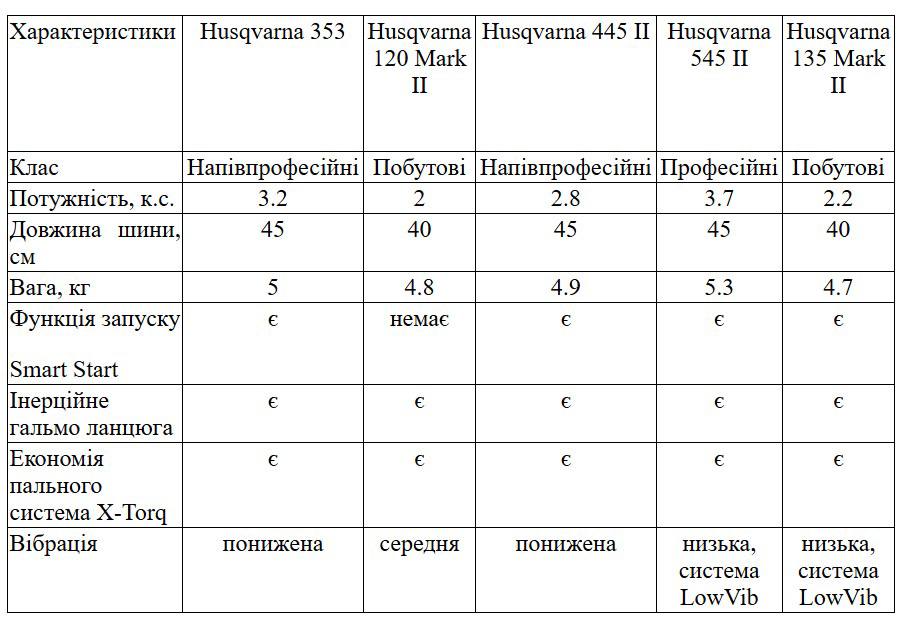 Порівняльна таблиця найкращих бензопил Husqvarna