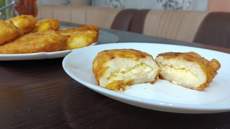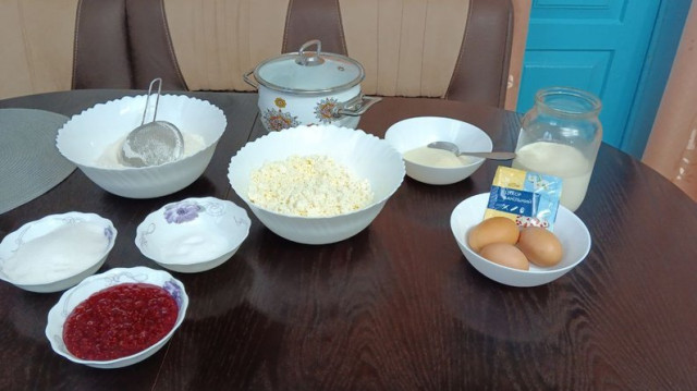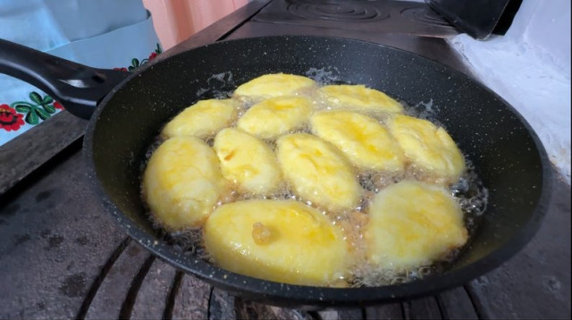 Для начинки до потрібно сиру додати цукор на смак, ванільний цукор та жовток. Далі до манки всередину кладеться готовий сир, заліплюється як пиріжок.