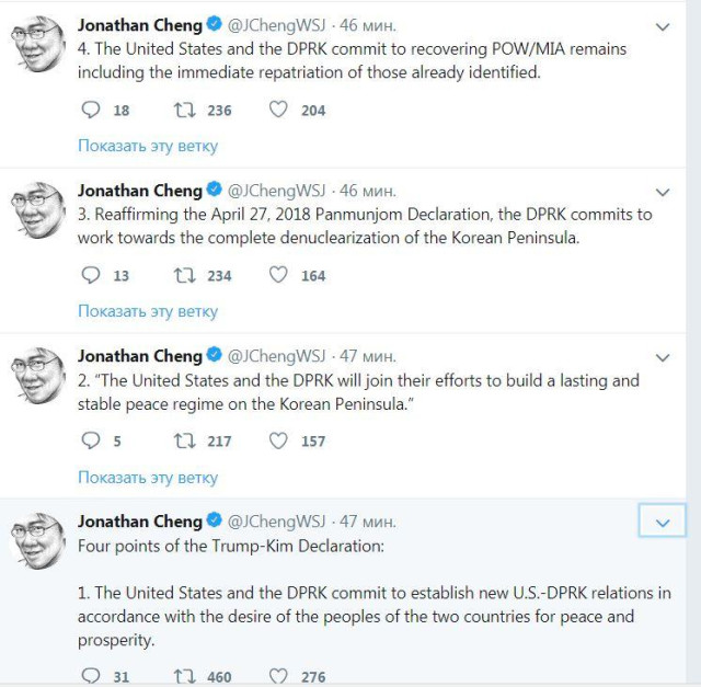 Нагадаємо, сьогодні в Сінгапурі відбувся історичний саміт між США та КНДР. Президент США Дональд Трамп і лідер КНДР Кім Чен Ин завершили зустріч віч-на-віч, на якій були присутні тільки перекладачі, а потім підписали спільний документ.