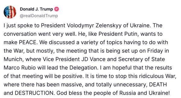 Глава США Дональд Трамп також прокоментував переговори з Президентом України Володимиром Зеленським, назвавши розмову «дуже гарною». Про це Трамп написав у своїй соцмережу у середу, 12 лютого.