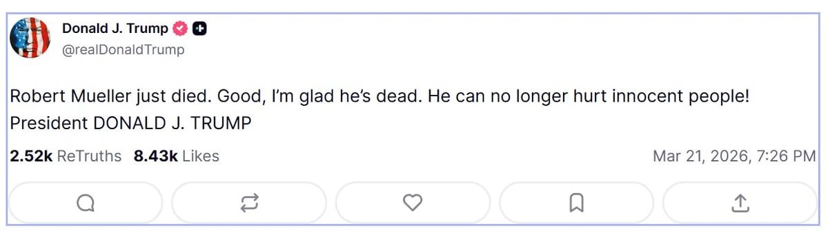 «Роберт Мюллер щойно помер. Добре, я радий, що він помер. Він більше не зможе завдавати шкоди невинним людям!» – написав він у соцмережі Truth Social.Читати ще: Зв'язки Трампа з Росією: у США оприлюднили нові дані про розслідування
