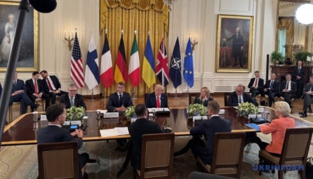 Президент України Володимир Зеленський, президент США Дональд Трамп і сім європейських лідерів провели спільну пресконференцію після двосторонньої зустрічі Трампа і Зеленського та перед початком багатостороніх перемовин у Білому домі.