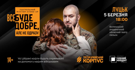 5 березня о 18:00 в Луцьк у Волинському академічному обласному театрі ляльок відбудеться мілібарі-стендап «Все буде добре, але не одразу» – трагікомедія про героїзм в простих речах, про справжнє кохання, чорний та білий гумор.