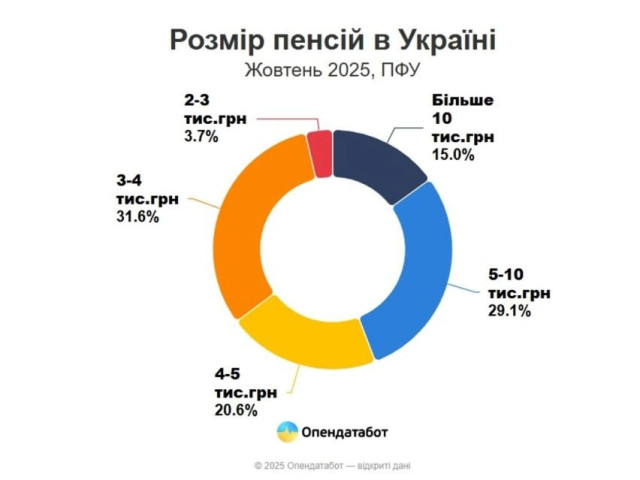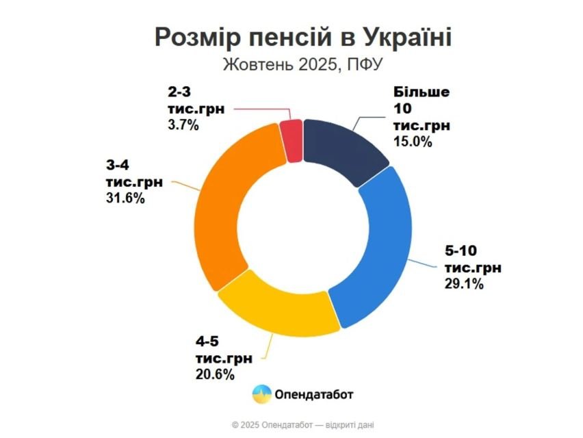 6,4 тисячі грн склала середня пенсія в Україні за даними Пенсійного фонду станом на початок жовтня 2025 року. Втім майже третина пенсіонерів отримують, в середньому, виплати у розмірі 3340 грн