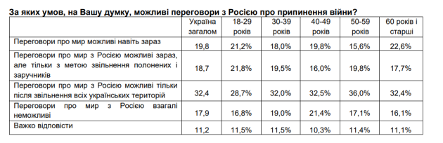 Водночас вона відзначила, що громадська думка ділиться на тих, хто вважає, що переговори з Росією можливі навіть зараз, але лише і винятково з метою звільнення українських полонених і заручників, захоплених Росією. Такий варіант підтримують 19%. Так само 19% опитаних принципово переконані, що переговори з Росією не можливі в принципі як такі. І 19% вважають, що переговори про мир можливі зараз без особливих передумов.