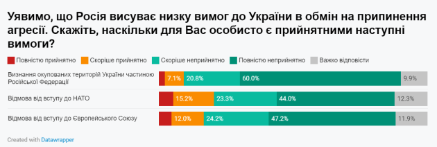 Золкіна відзначила, що при цьому переважна більшість українців, так само як і протягом попередніх років, продовжує демонструвати свою неготовність виконувати ті вимоги Росії, які та наполегливо просуває як вимоги до України для завершення війни.Йдеться про визнання окупованих територій частиною РФ. На таку вимогу Росії готові пристати лише 9% українців, неприйнятним це вважають 81% українців, зазначила Золкіна.