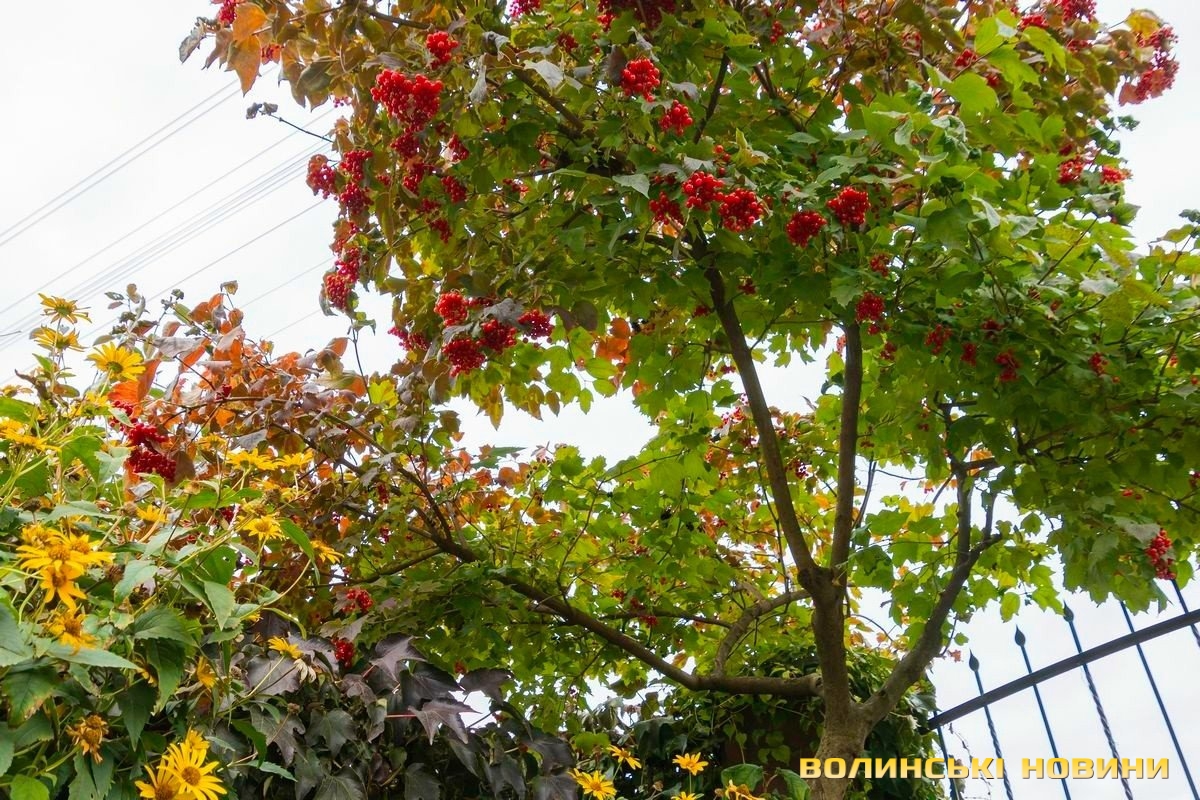«Отут попід хатою в нас навесні тюльпани цвітуть, – показує. А там – бачите стебла – то півонії. Одні то звичайні, червоні, а ще в нас є кущ півоній незвичайного оливкового кольору. От приходьте наступного року в червні – побачите, які вони пишні. А отам-о, де стійка, в нас клематиси ростуть. То теж вельми гарні квіти. Але вже відцвіли».Алла Андрощук у себе на подвір’ї саме підстригає кущики самшиту. Каже, їх дуже любить її донька. А сама пані Алла, попри неабияку зайнятість ( жінка працює у ВНУ імені Лесі Українки), усе ж знаходить час, аби приділити увагу улюбленим квітам, яких у неї – до кольору до вибору. Каже, любов до них успадкувала від мами.«У мене дуже багато квітів – і лілійники, й іриси, й гортензії, і кали, і, звісно ж, улюблениці-троянди, – перелічує. – Правда, майже все вже поперецвітало, оце ще хризантеми хіба радують цвітом».На порозі примостилися вазонки з різнокольоровими калачиками. Біля воріт – кущ калини, гілки якого донизу хилять китиці ягід. Його, каже жінка, посадив її чоловік.«Він у мене теж шанувальник рослин, – каже пані Алла. – Щоправда, я по квітах, а він – по деревах. Сам садить, сам щеплює, доглядає».