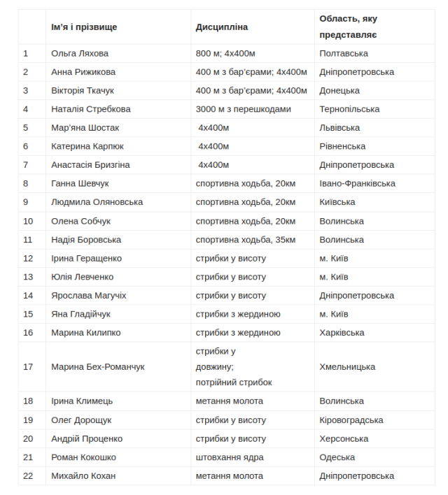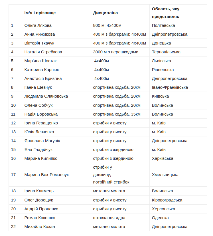 Зокрема Ірина Климець метатиме молот, Надія Боровська виступить у заході на 35 км, а Олена Собчук – на 20 км у спортивній ходьбі.