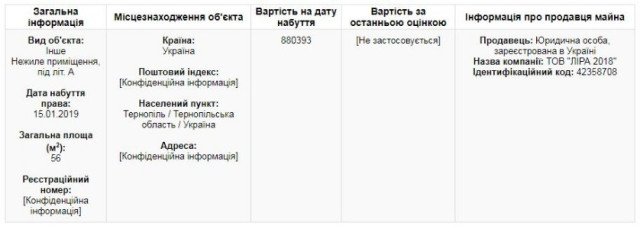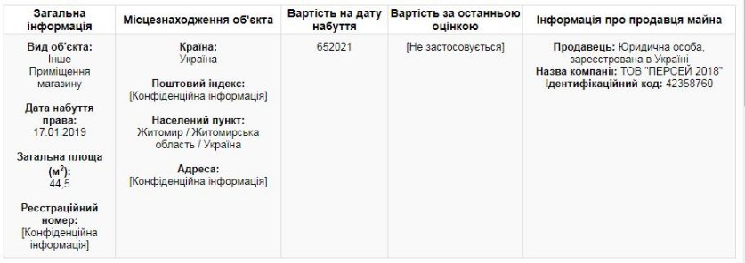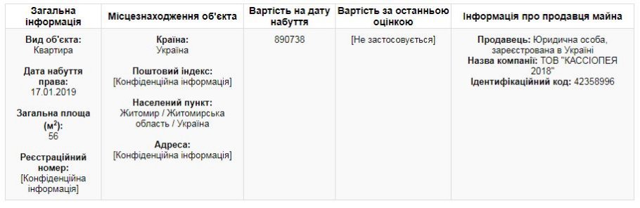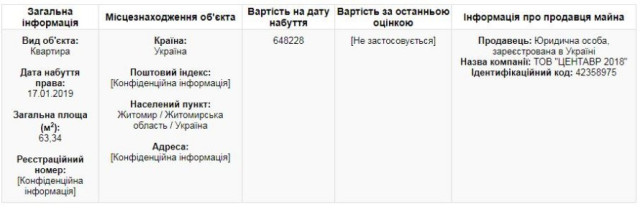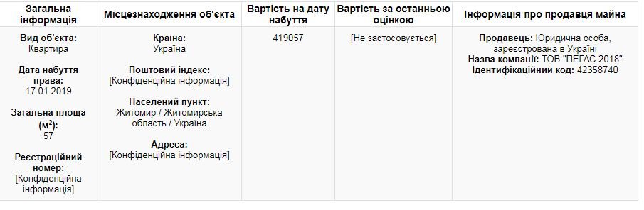 Обранець купив три квартири у Житомирі площею 57, 56 та 63 квадрати. Також у цьому місті він викупив приміщення магазину площею 44,5 квадрати.