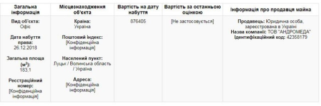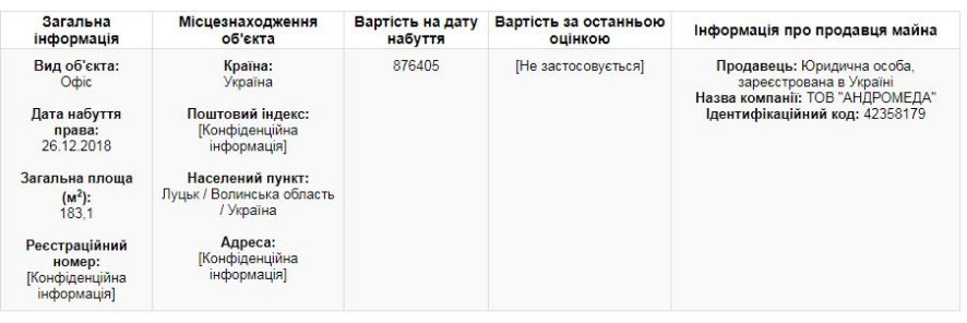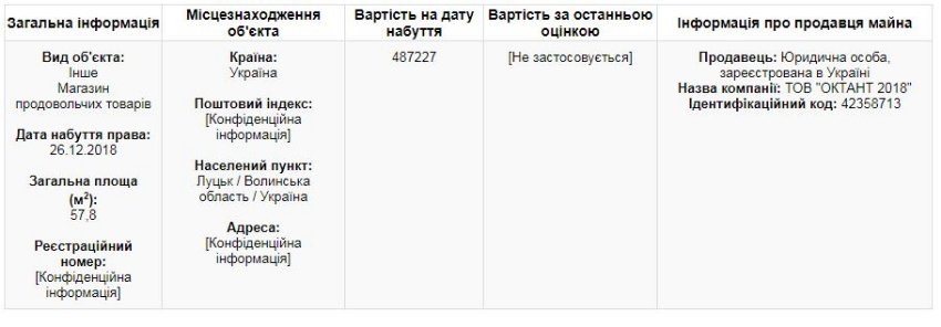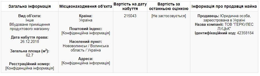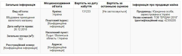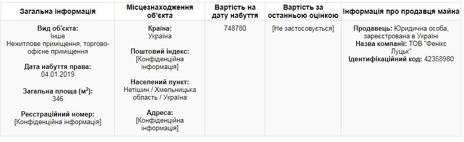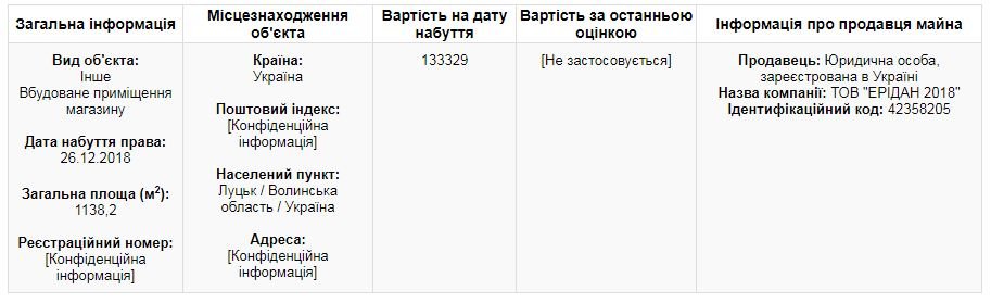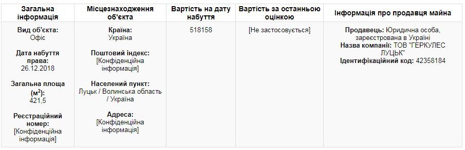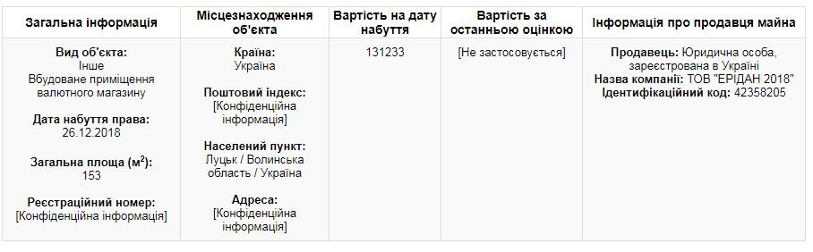 Викупив деяку нерухомість і в Луцьку: приміщення валютного магазину 153 квадрати, іще двох магазинів 1138 та 58 квадратів та два офіси: розмірами 183 і 421 квадратний метр.