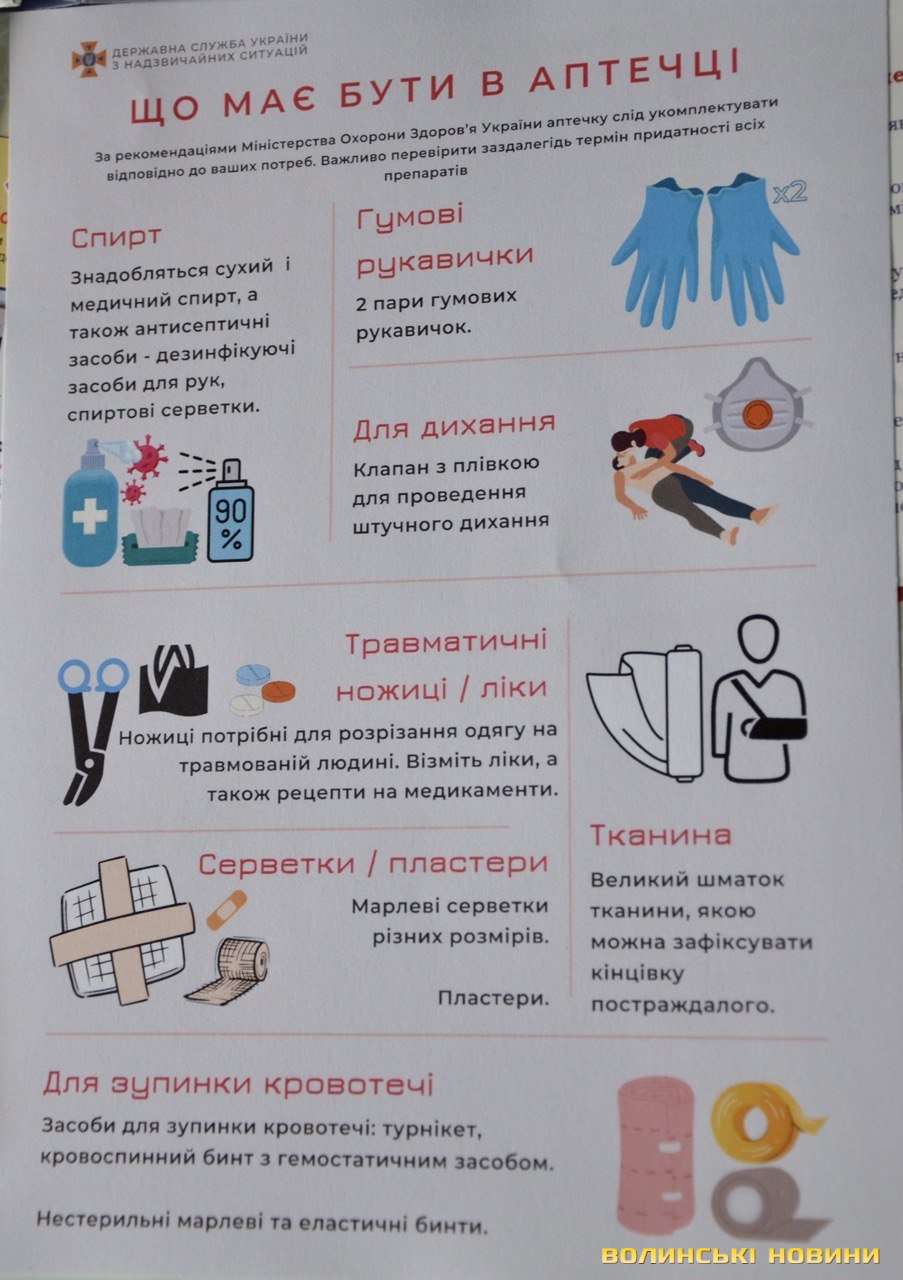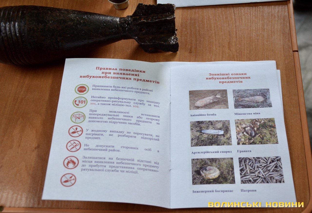 На випадок надзвичайної ситуації він порекомендував сформувати аптечку з асептичними засобами, перев’язками, пов’язками, бинтом, джгутом, знеболювальними засобами, розчином спирту чи йоду для обробки ран тощо.Водій-сапер групи піротехнічних робіт аварійно-рятувального загону спеціального призначення УДСНС у Волинській області Ігор Пархомович назвав правила поведінки при виявленні вибухонебезпечних предметів, наприклад, боєприпасів часів Першої та Другої світових воєн.