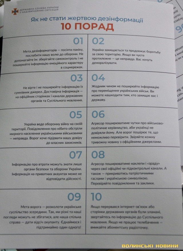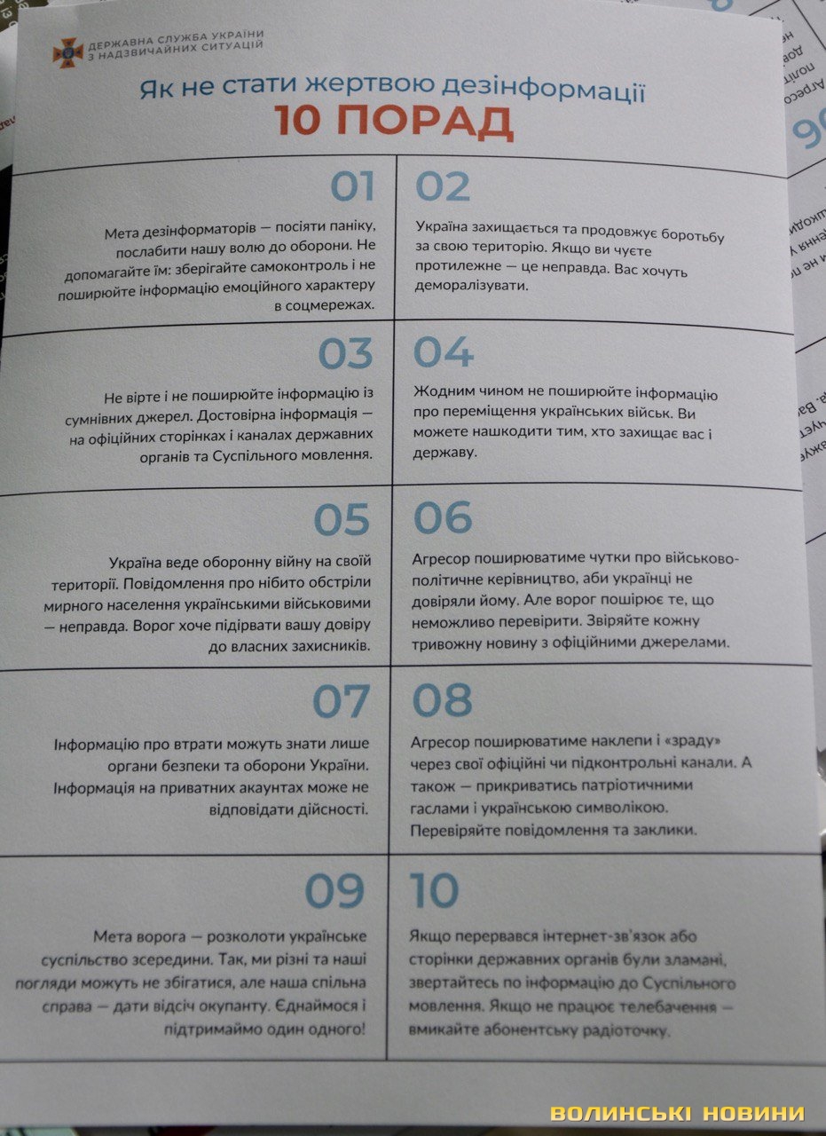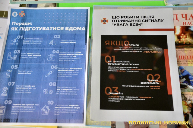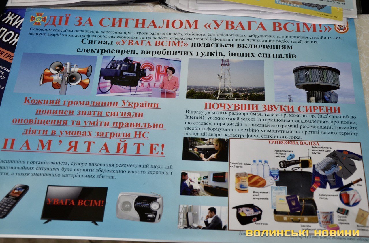Також усі охочі можуть узяти для ознайомлення роздаткові матеріали про перші дії під час евакуації, те, як підготуватися удома на випадок надзвичайної ситуації, що робити після сигналу «Увага всім!» чи як не стати жертвою дезінформації.Як інформувала майстер виробничого навчання Навчально-методичного центру цивільного захисту та безпеки життєдіяльності у Волинській області Алла Семінович, на Волині діють дві системи оповіщення: ще радянського зразка та новітня. В разі надзвичайної ситуації вмикається система оповіщення і людям відразу дають відповідні вказівки.